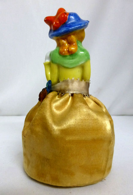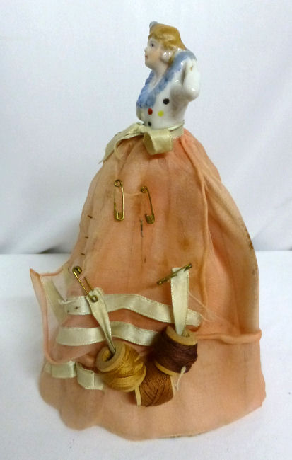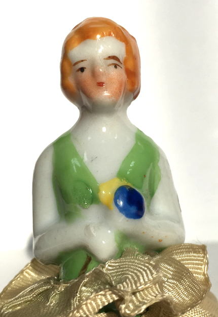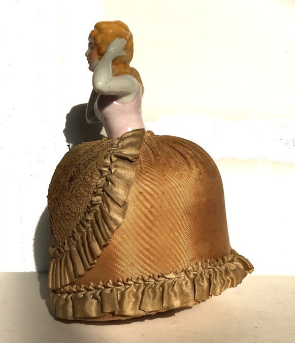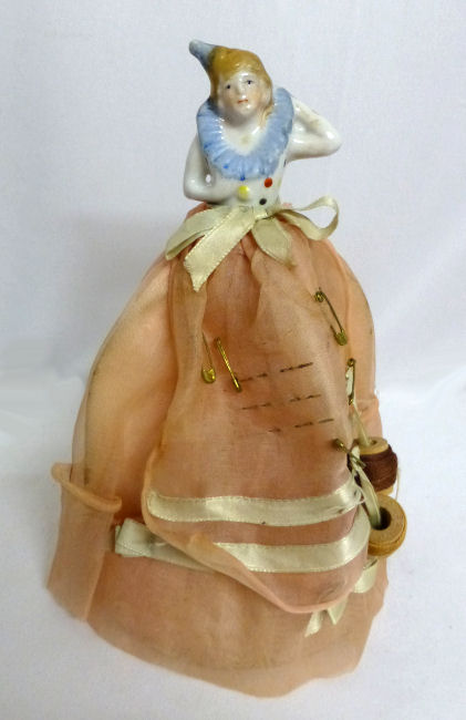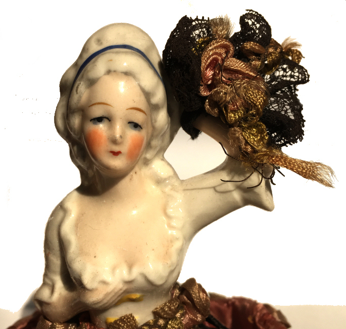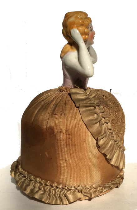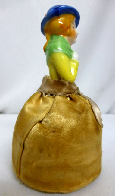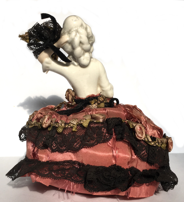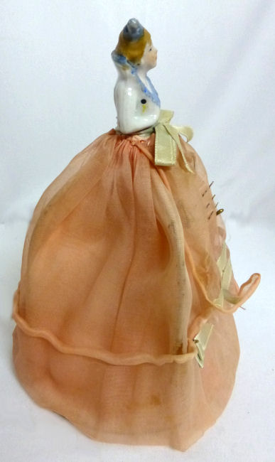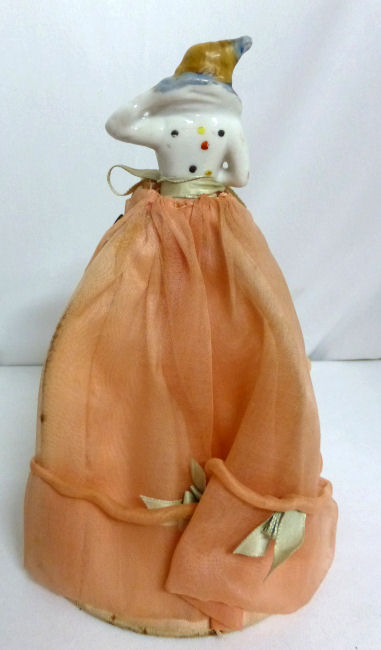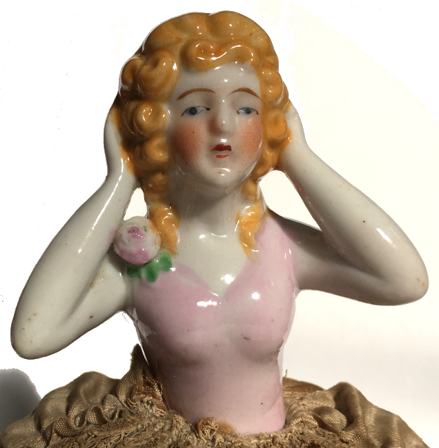 Here is a cute little porcelain half-doll pin cushion in all original condition. Some water stains on the skirt portion and one split in the silk (visible in the photos). Cute little flower decorations hang on the waist ribbon ... some type of early plastic or celluloid. Measures 5" high overall x 2-3/4" diameter at base; doll itself is 2-1/2" high. NOTE: All of the pincushion/dresser half dolls came from a local estate here in the Pittsburgh area that we purchased back in 2006. I am finally relinquishing them! :-) (Click on pic for more photos.) |