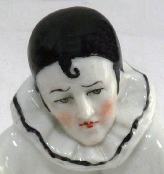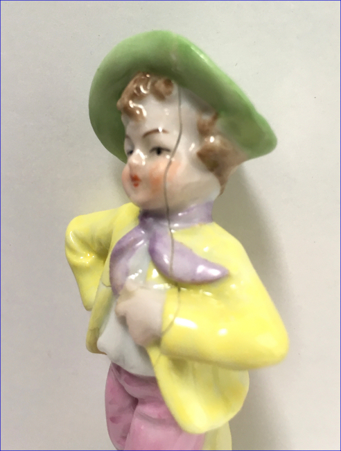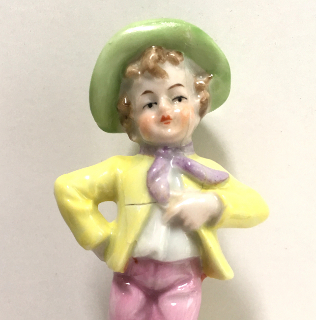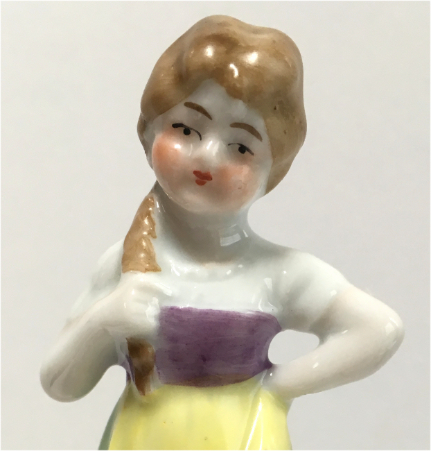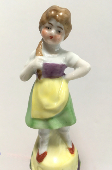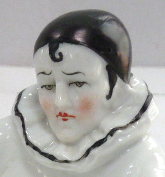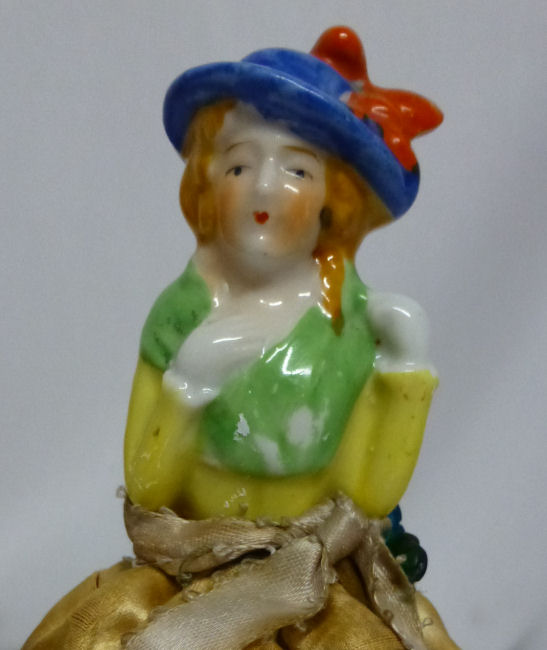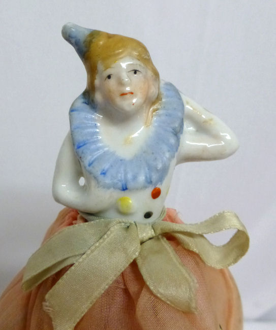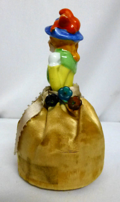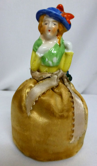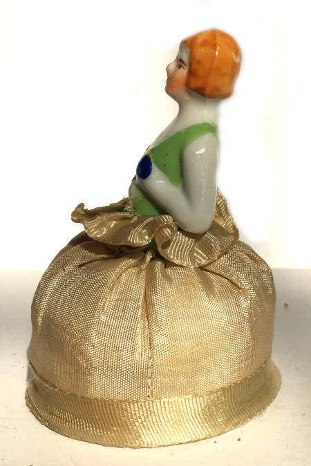 Here is a cute little porcelain half-doll pin cushion in all original condition. Some water stains on the skirt portion and one split in the silk (visible in the photos). Cute little flower decorations hang on the waist ribbon ... some type of early plastic or celluloid. Measures 5" high overall x 2-3/4" diameter at base; doll itself is 2-1/2" high. NOTE: All of the pincushion/dresser half dolls came from a local estate here in the Pittsburgh area that we purchased back in 2006. I am finally relinquishing them! :-) (Click on pic for more photos.) |