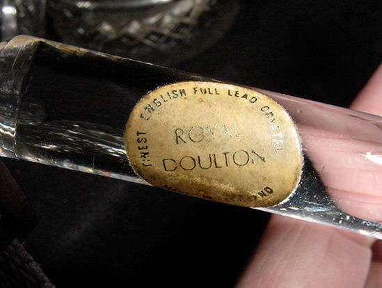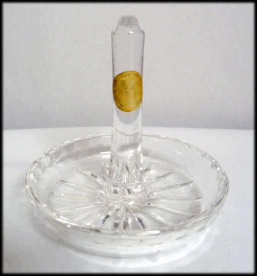 As the label says, this ring holder with tray is made of "Finest English Lead Crystal" by Royal Doulton. It is in excellent condition and measures 3-1/4" diameter x 3" high. (Click on pic for more photos.) |