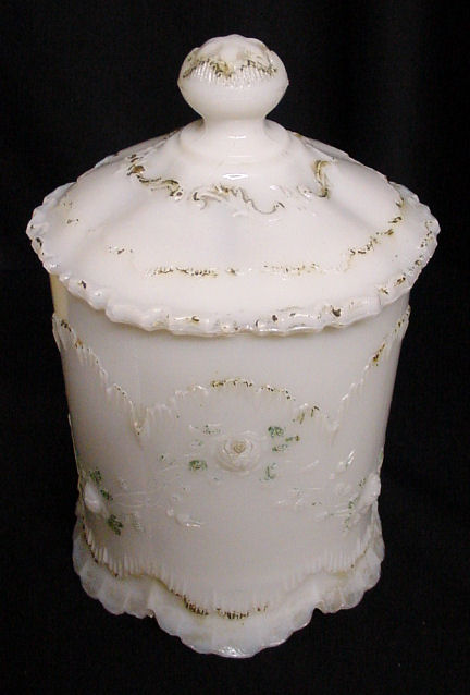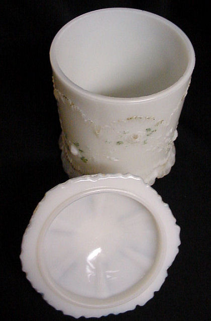 Here is an early milk glass apothecary jar with traces of original paint still on the sides and lid. The design is very pretty with scalloped design surrounding the bottom and ornate edge on lid. Called "fire opalescent" due to the fire that reflects pink in the edges of the milk glass when held to light. Excellent condition ... there is one chip on the edge of the top but with all the curlicues in the design, I didn't even notice it until I inspected it for this listing ... not an issue at all. Great for storing cotton balls! Measures approximately 4-3/4" diameter x 7-1/2" tall. (Click on pic for more photos.) |