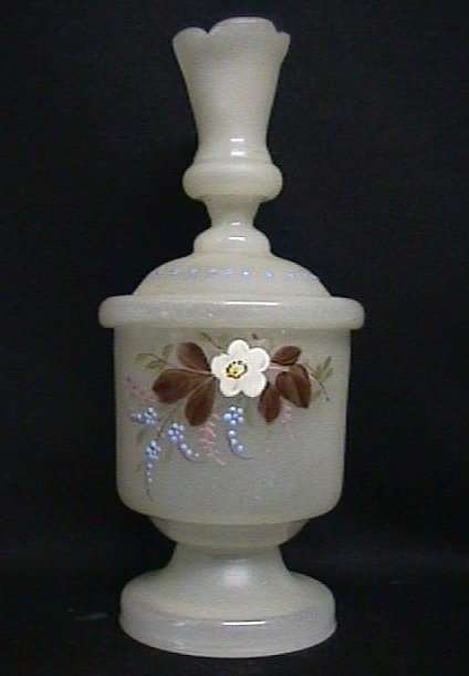 This is a beautiful Victorian Bristol glass two-piece vanity jar with a bud vase on the top. The flowers on the side are all hand-painted in lovely shades of blue, white and rust on opaline background. Measures 9" tall. (Click on pic for more photos.) |