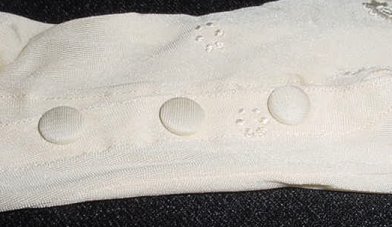 Lovely ecru silk dress gloves with embroidered designs, triple button closures. Not marked but fit a size 6. Measure 20" long. Condition: Only slight signs of ever being used; there is a seam separation about 1/4" right at seam between index and middle finger (can easily be mended). These will be shipped via USPS. (Click on pic for more photos.) |