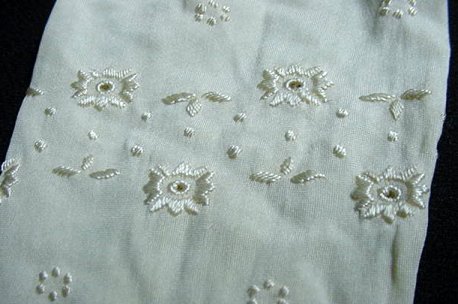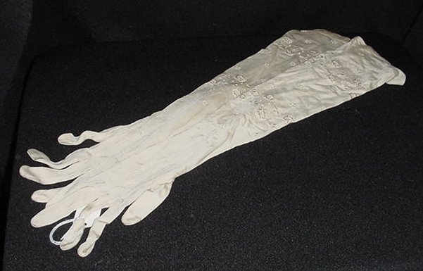 Lovely ecru silk dress gloves with embroidered designs, double button closures. These appear to have never been worn. Not marked but fit a size 6. Measure 19" long. These will be shipped via USPS. (Click on pic for more photos.) |