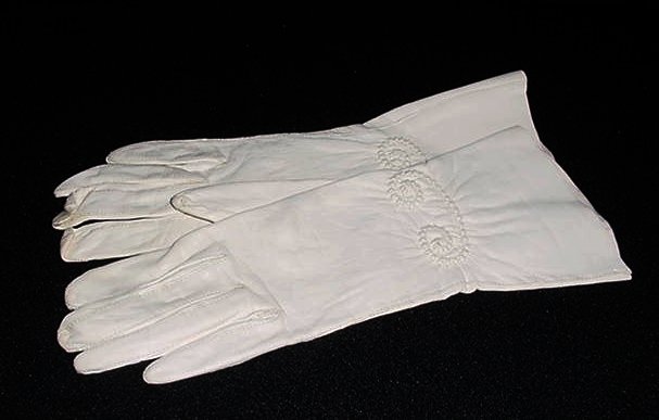 Soft white kid leather dress gloves with embossed designs ... marked size 6 and measure 10-1/2" long. Condition is very good with some very minor soiling at fingertips. They were barely used. These will be shipped via USPS. (Click on pic for more photos.) |