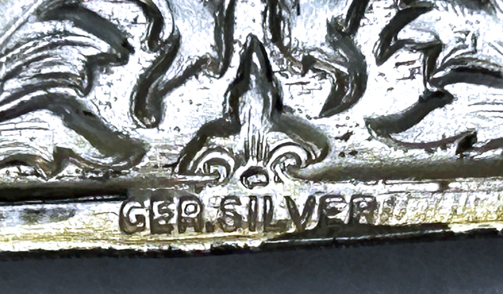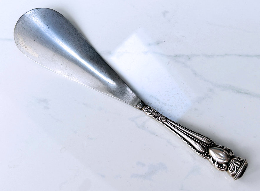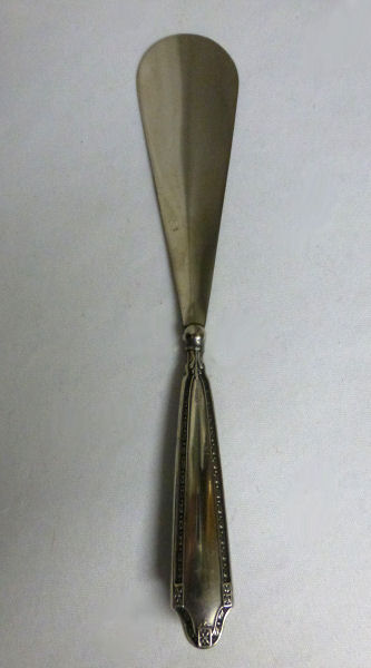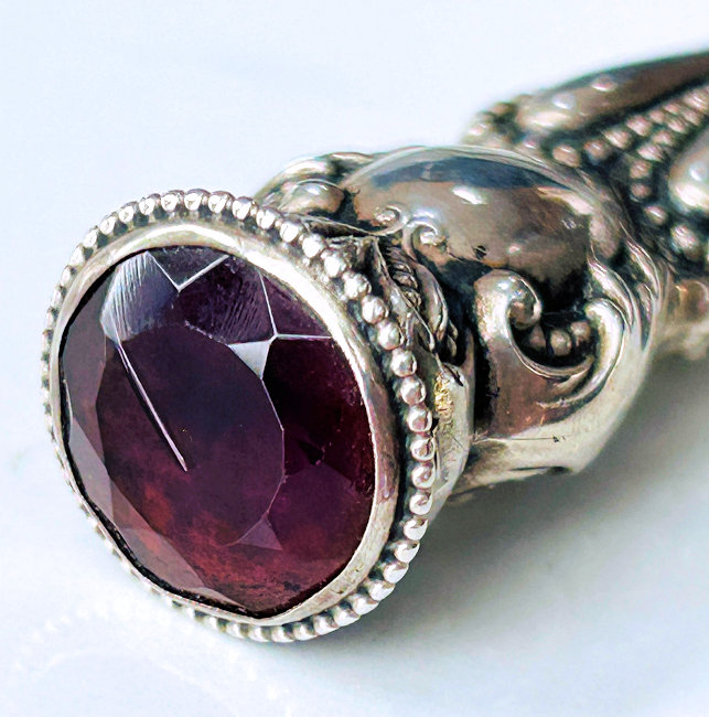 This beautiful shoehorn is crafted of sterling silver in repoussé designs (the shoehorn portion itself is not sterling, just the handle). What makes this one extra special is the beautiful facet-cut amethyst jewel on the tip of the handle. I can't be sure the amethyst is real, or faux, but in either case it is quite nice. There is a noticeable scratch across the surface which I have not attempted to polish out. Based on this, I have priced it accordingly. It is marked STERLING on the on both sides of the handle and GERMANY on the horn.. Measures 7-1/2" long. (Click on pic for more photos.) |