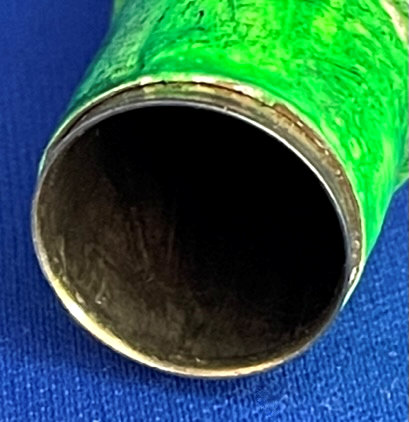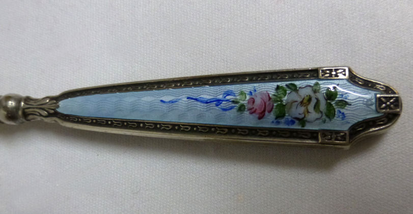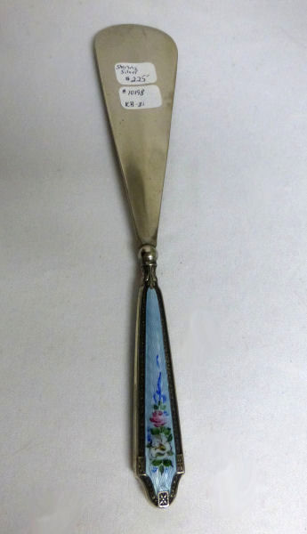 This is such a pretty shoehorn that you will want to leave it out on your dresser. Sterling silver handle with blue enamel guilloche on the top side with hand-painted floral bouquet and ribbons ... so lovely and feminine! It is in excellent condition with no damage to the enamel whatsoever. Shoehorn has some scuffing which is age appropriate and I did not try to polish or buff out. See pictures for close-ups. Measures 8-1/2" long. (Click on pic for more photos.) |