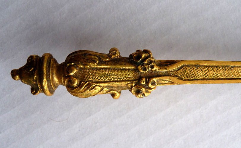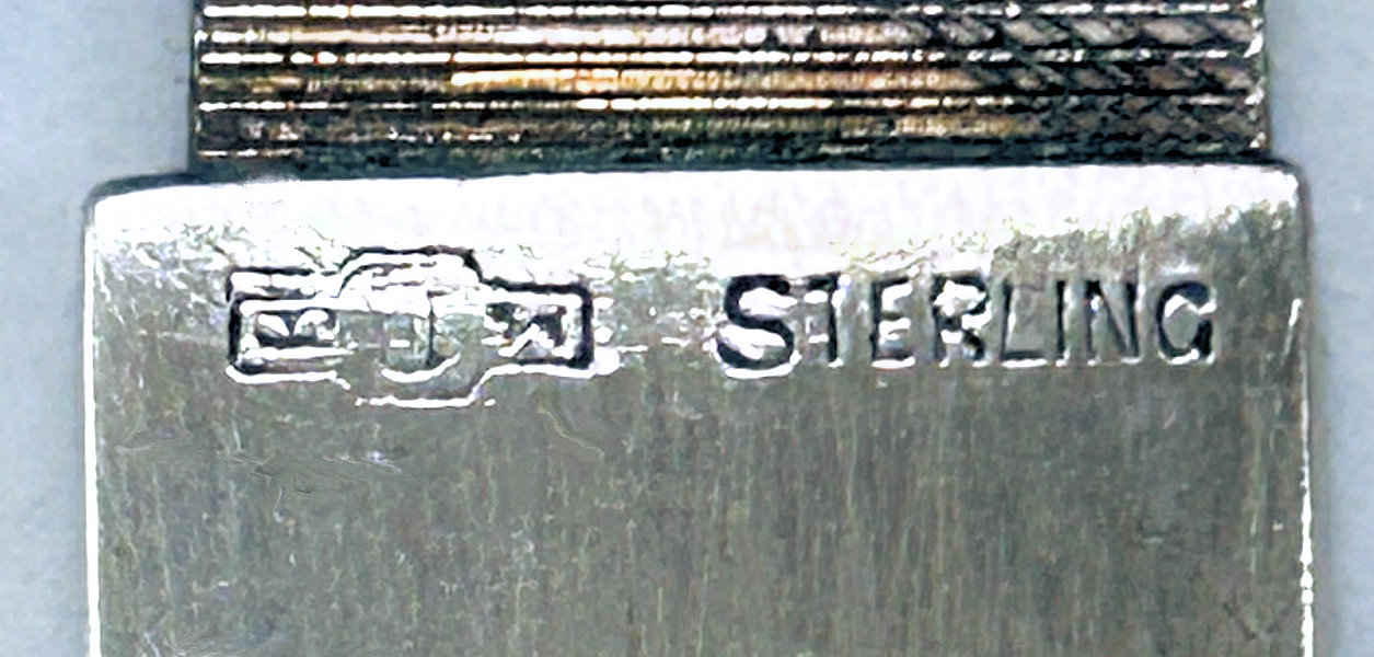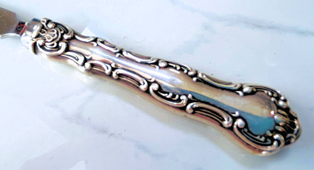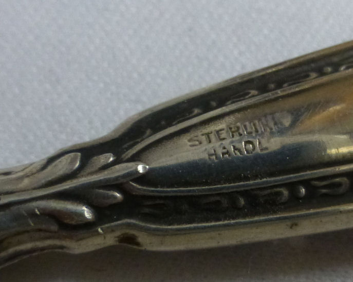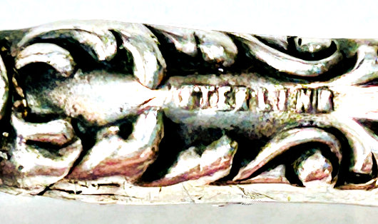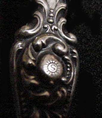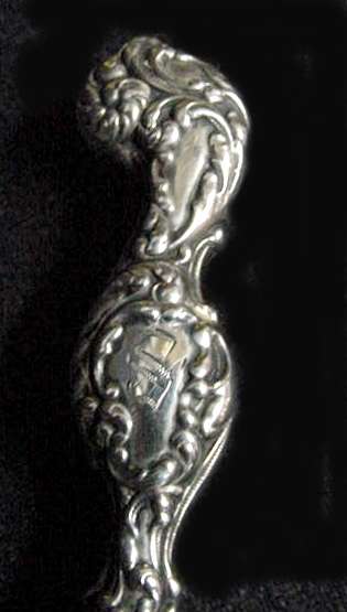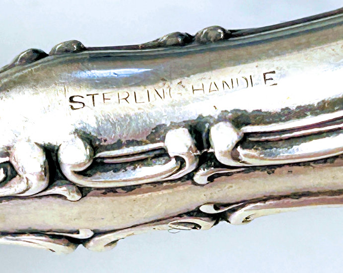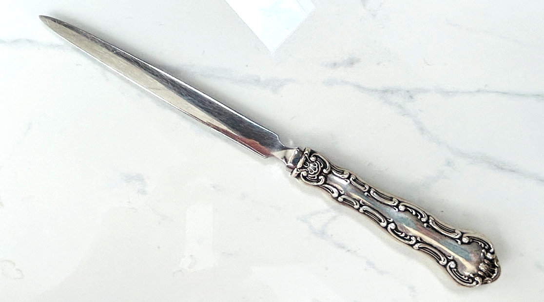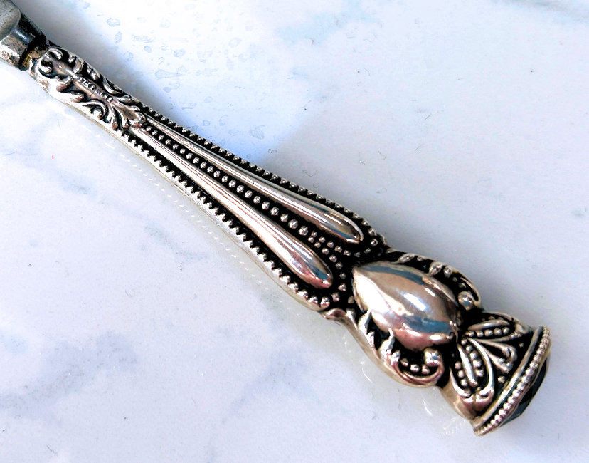 What a lovely letter opener this is! It is made of sterling silver with repoussé designs (the blade portion is unmarked) and was probably a wedding gift for Sue & Bob as their names are inscribed on the tip of the handle with the date 3-19-49. It is in fabulous condition with no obvious signs of use ... it is bright and shiny and just gorgeous. It is marked "STERLING HANDLE" on the handle. Measures 7-3/4" long. (Click on pic for more photos.) |