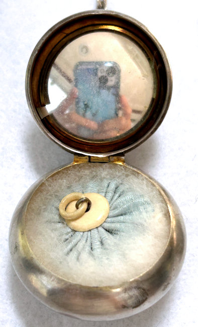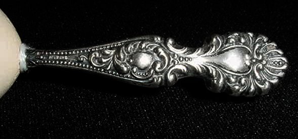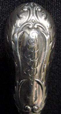 Adorable little darning egg with sterling silver repousse' handle, dates from the Victorian era. Measures 5-1/2" overall and is in very good condition with only minor nicks on the ivory colored egg from age-appropriate wear. (Click on pic for more photos.) |