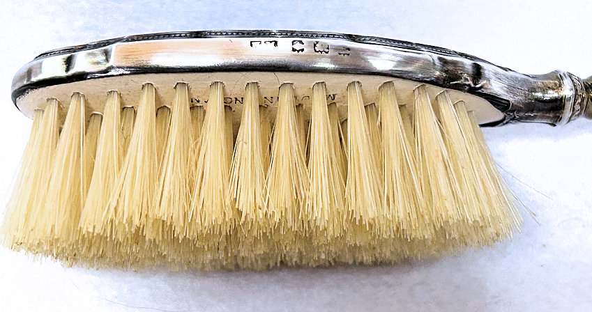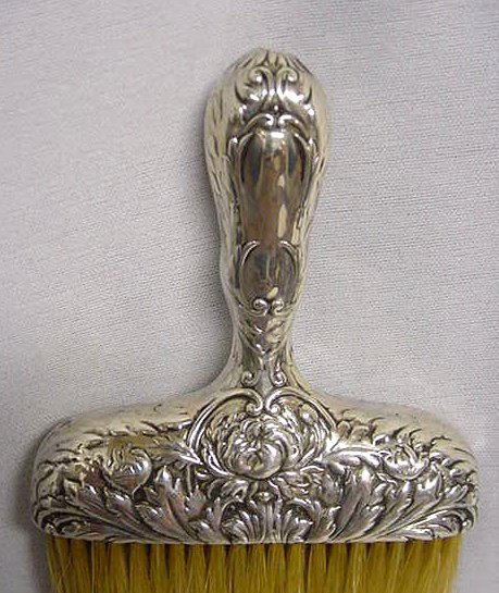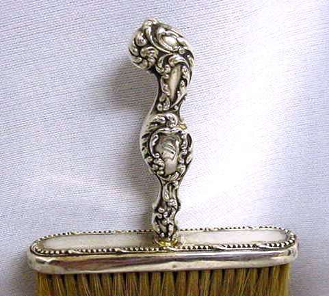 Here we offer a lovely sterling silver clothing brush with repousse' handle. Natural bristles, all in great shape! There is a monogram on the handle which appears to be an "S". Measures 5-1/2" high x 3" wide x 5/8" thick. (Click on pic for more photos.) |