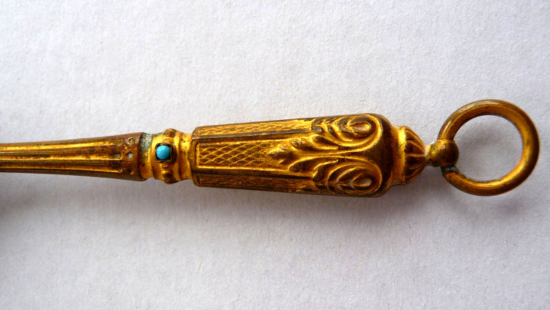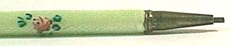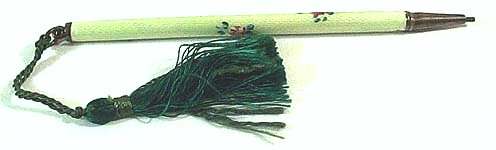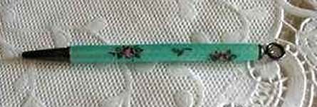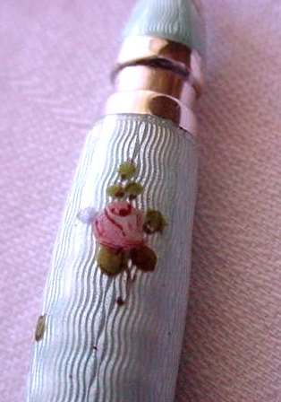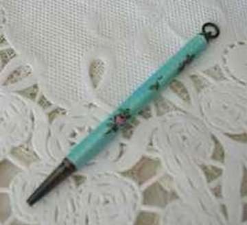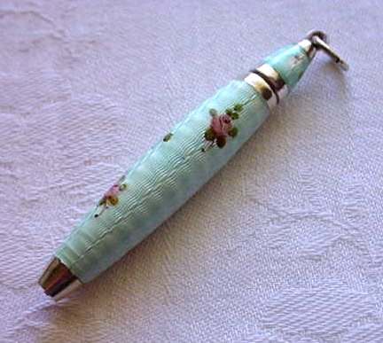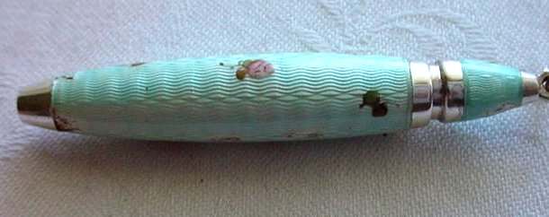Chatelaines were elegant ways for women to carry utilitarian pieces and this is an exceptionally pretty example that was made for a very fancy chatelaine. It is very tiny ... measures only 2-3/4" long not counting the little hanging ring and is only 3/16" diameter. The pencil is done in a very pretty aqua enamel guilloche with hand-painted pink roses throughout. I am not exactly sure how the lead is inserted as the tip seems to only turn back and forth for a short distance. I think possibly you load it from the tip and simply rotate it inward and outward to use it. Since there is no lead in it at present, I cannot be sure. There are marks on the ring but this piece is so tiny that I cannot make it out but I believe it says Sterling. Excellent condition! (Click on pic for more photos.) |