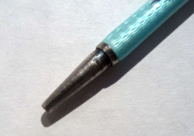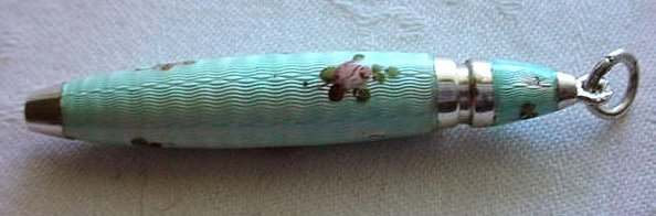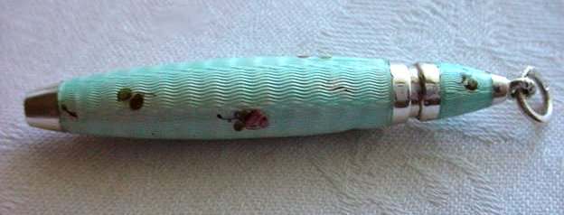 Pretty baby blue enamel guilloche sterling silver mechanical pencil for chatelaine. There is some minor enamel loss that looks much worse in the larger-than-life pics. This is an unusual piece! It is a little difficult to open completely (at least for me it is). Measures approximately 2-1/2" when closed. (Click on pic for more photos.) |