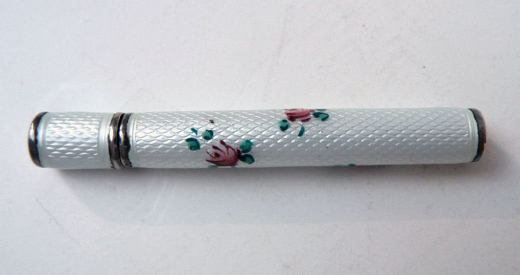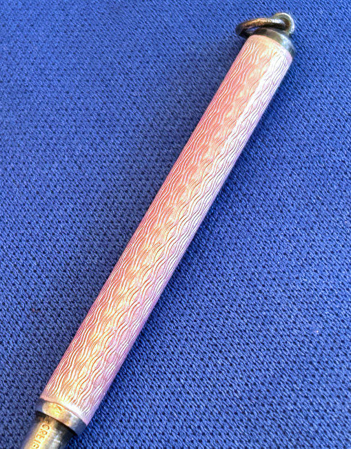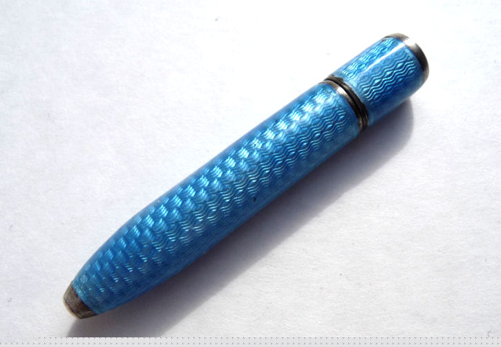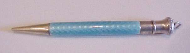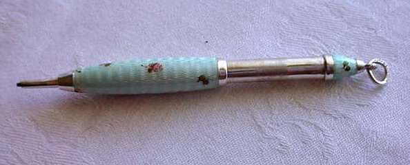 This lovely sterling silver and blue enamel guilloche pencil was probably made to be worn on a chatelaine. It is signed on the top Ritewell and the design was patented. Still works! Previously listed for $250 ... now offered below my cost! (Click on pic for more photos.) |