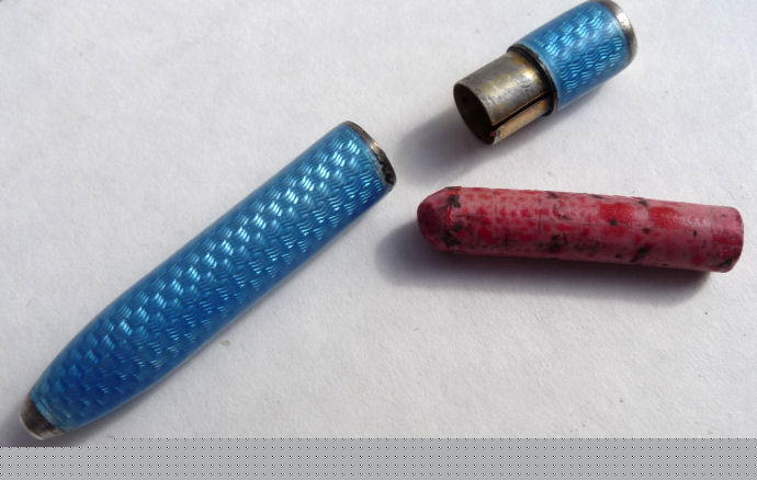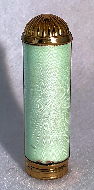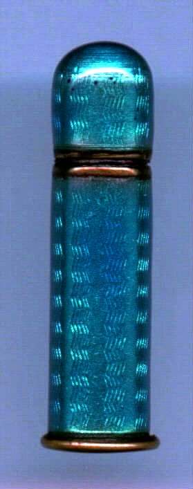 Pretty lady's teal blue enamel guilloche lipstick holder marked Germany. Tarnishes like sterling but not marked that I can see. Remnants of old lipstick inside. Enameling is in good shape all the way around. Very pretty and reasonably priced. (Click on pic for more photos.) |