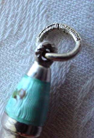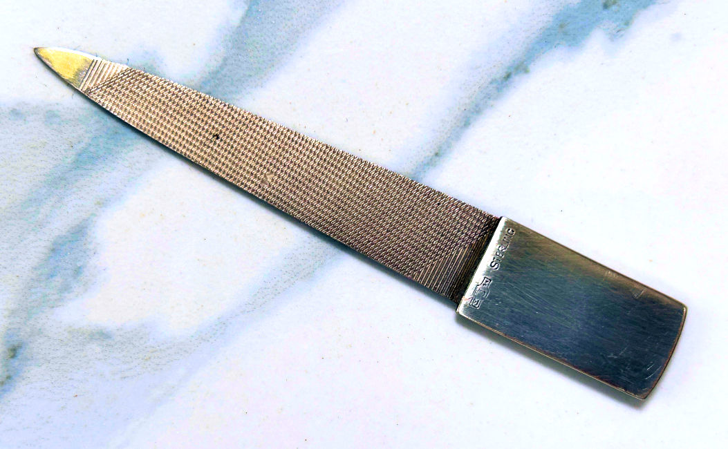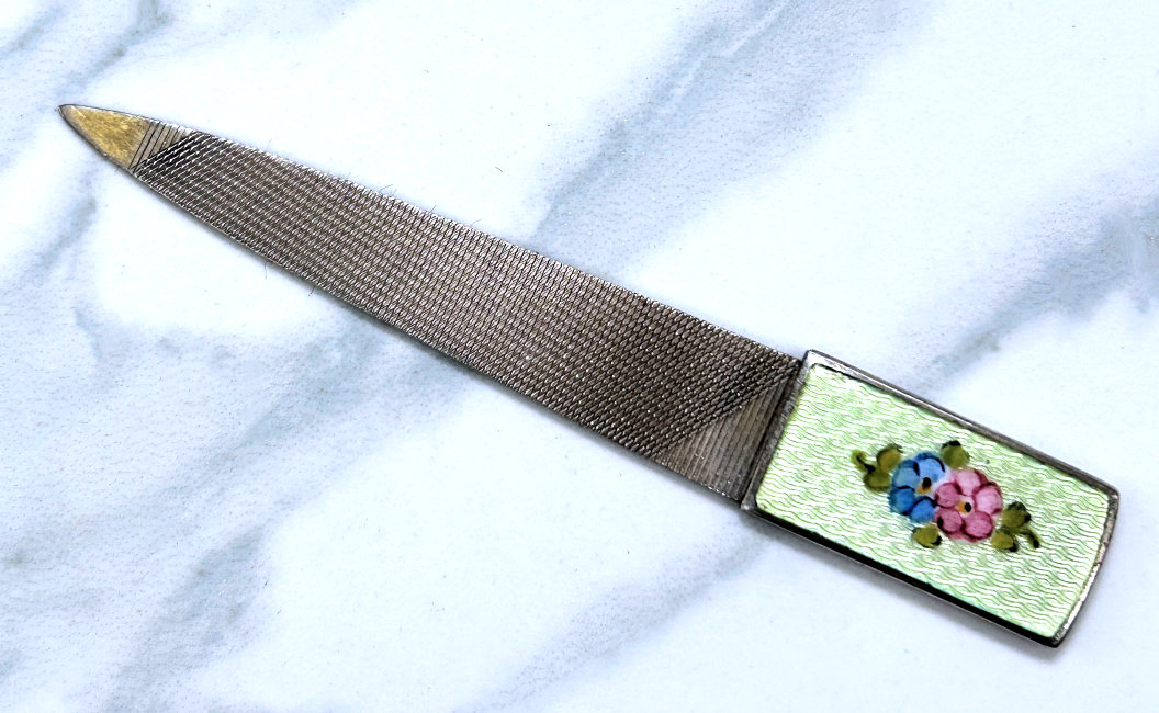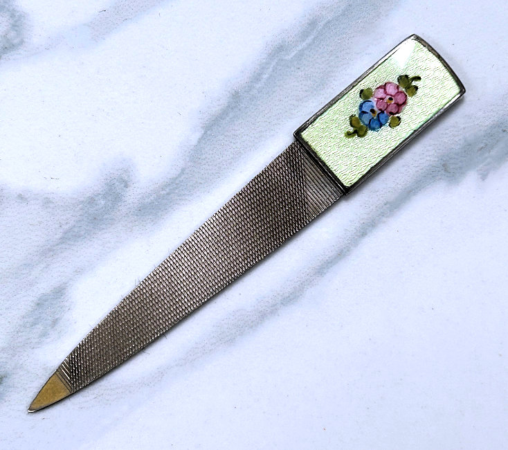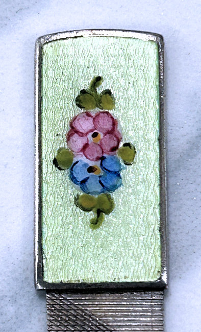 This is a beautiful sterling silver nail file made by Thomae with a mint green enamel guilloche top with hand-painted flowers in the center. This little file is the perfect size for carrying in your purse ... it measures 3-1/4" long overall and only 1/2" wide at the end. It is in excellent condition. (Click on pic for more photos.) |