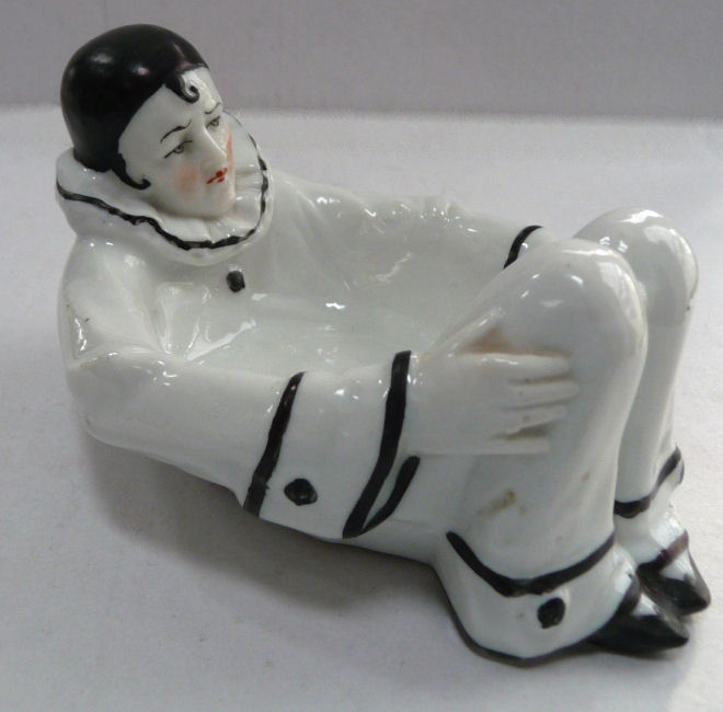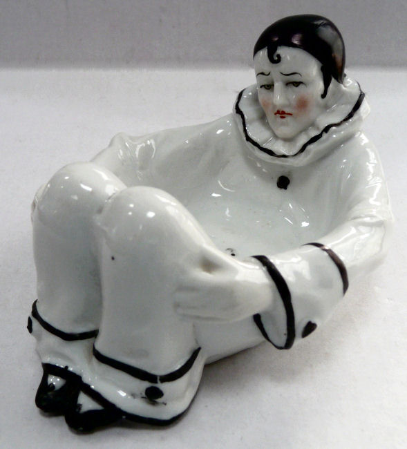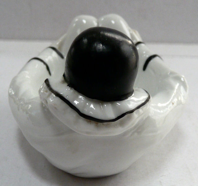 I have had this wonderful little fellow in my collection for years ... I always debated putting a puff in the dish but didn't want to take away from the buttons visible on his tummy. I would date this piece from the early 1900's as it is marked for the Sitzendorf Porcelain Manufactory of Germany. It is all snowy white with black hand-painted trim and nicely detailed face, right down to the exprssive eyebrows and forehead curl. It is in excellent condition with only some minor wear to the black paint ... all in all a great piece! Measures approx. 4-1/2" long x 3-1/4" wide x 2-1/2" high. (Click on pic for more photos.) |