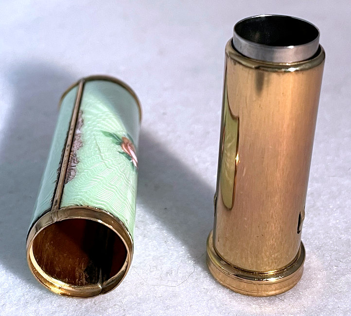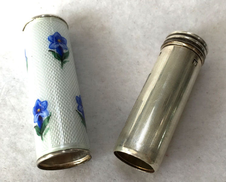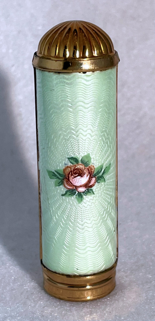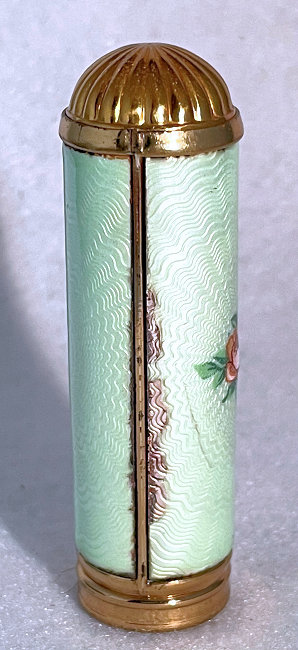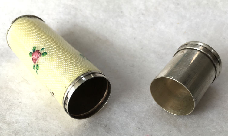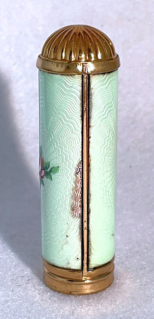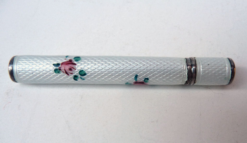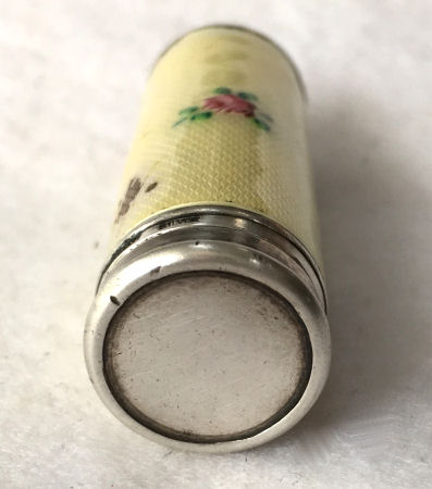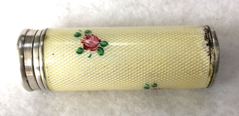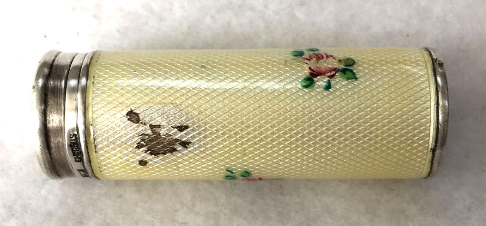 Pretty lady's sterling silver enamel guilloche lipstick holder. Larger size ... 2" long with diameter of 5/16". Cream colored enamel guilloche with hand-painted deep roses evenly spaced around. Inside case has short lipstick holder (no swivel). Unfortunately, there is a very wee bit of enamel loss at very bottom edge and a larger area of loss on one side as shown in pictures. Therefore, it would be a piece to either use or display with good side out. (Click on pic for more photos.) |