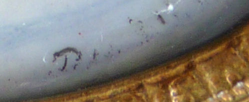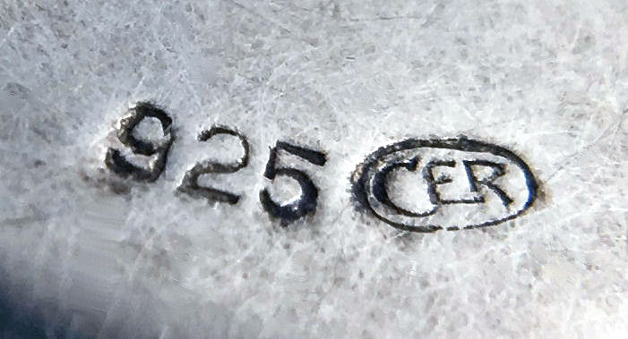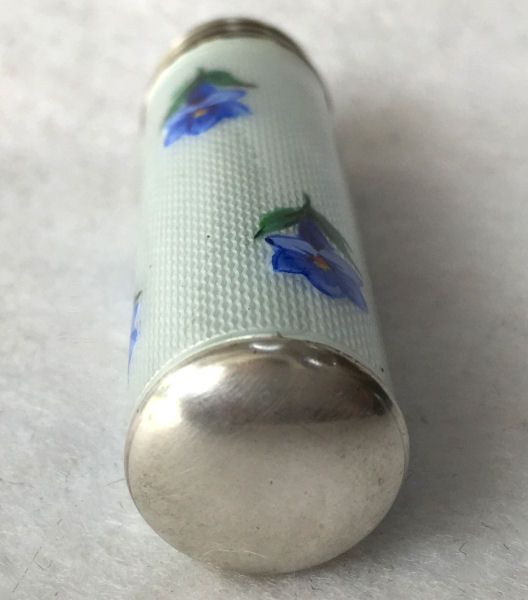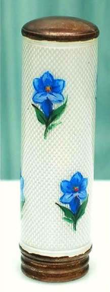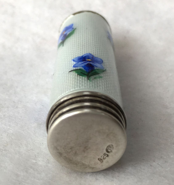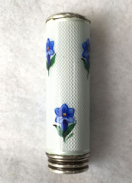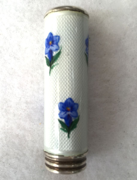 Pretty lady's sterling silver enamel guilloche lipstick holder. This one is a larger size ... 2-1/4" long with diameter of 5/16". Snowy white enamel guilloche with hand-painted deep blue forget-me-nots evenly spaced around. Inside case has engine-turned fine stripes in metal. There is just a very wee bit of enamel loss at very bottom edge ... very difficult to see even in person. Case is marked 925 sterling and the letters "CER" which I have not been able to yet identify. (Click on pic for more photos.) |
