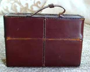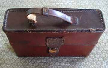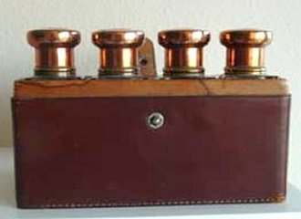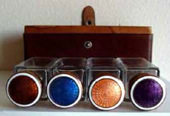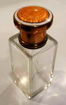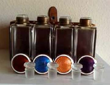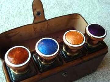 This is a lovely traveling set with original leather case containing four large bottles with glass stoppers and beautiful enamel guilloche lids. Bottles all have polished bottoms and sides ... better quality crystal. Lids are done with what appears to be copper mountings and screw on tightly to the collars. Bottles measure 1-3/8" square x 4" tall. Leather case measures 6-1/2" wide x 1-3/4" deep x almost 4-1/2" high. Stitching on lid is coming loose and there is general overall wear to the case but handle is intact and snap closure still holds. Just a beautiful set! (Click on pic for more photos.) |