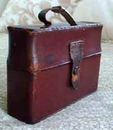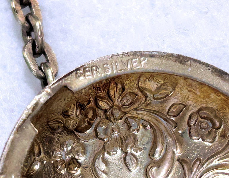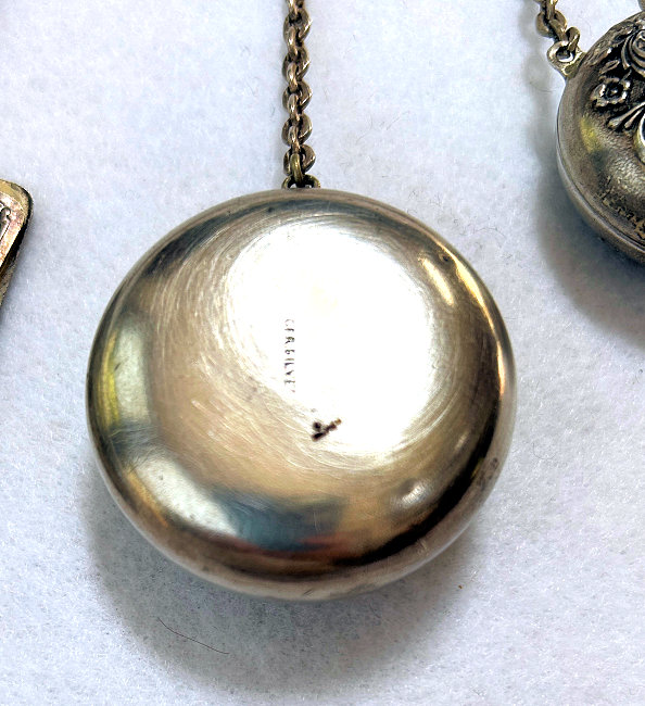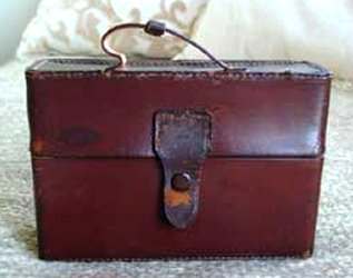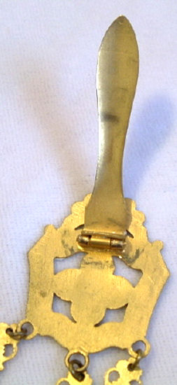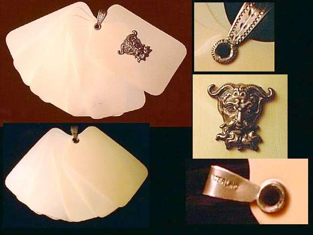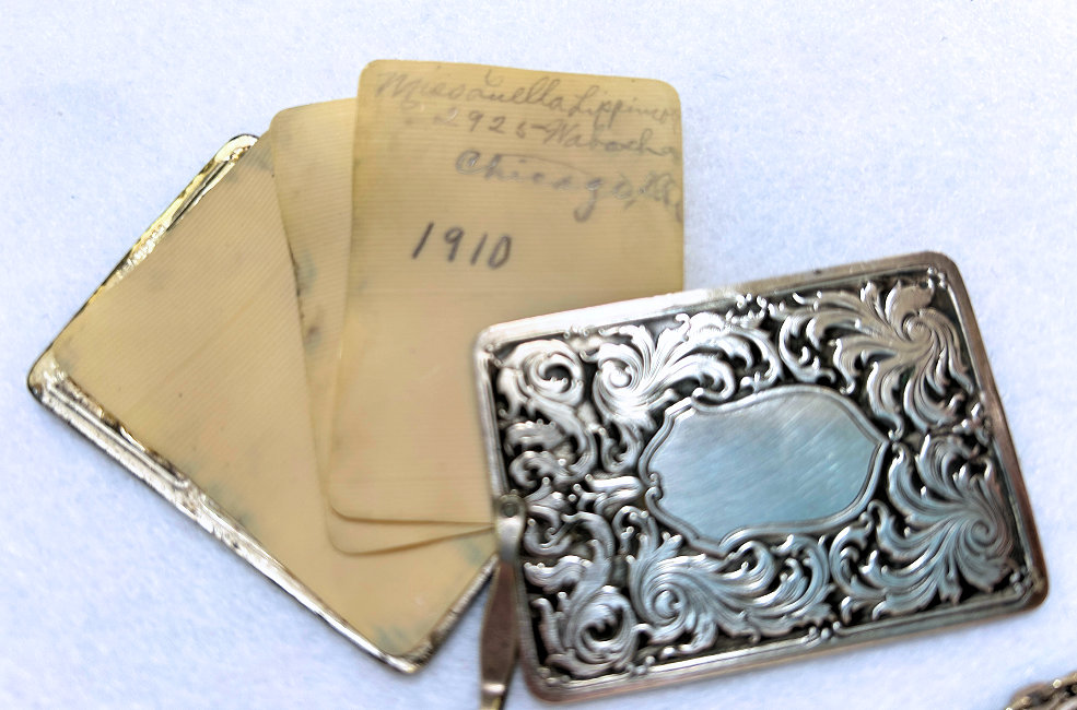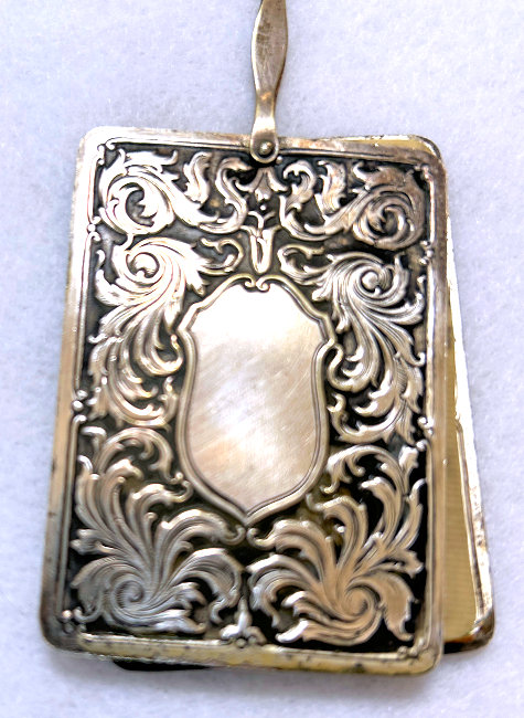 There sure aren't many of these items floating around these days! This is a late Victorian era dance tablet that was meant to be worn on a chatelaine. The hook and "devil" head are sterling silver and the tablet sheets are celluloid. It would take quite a few dances to fill this up! The original owner must have been quite the popular lady! (Click on pic for more photos.) |
