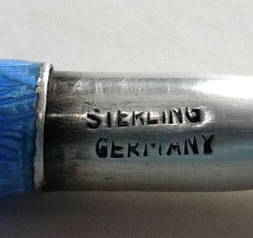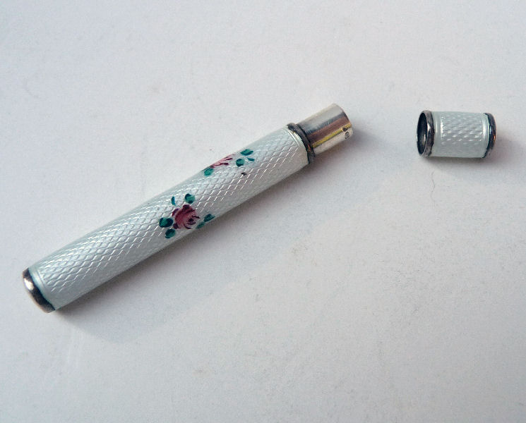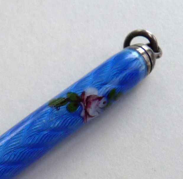 Chatelaines were elegant ways for women to carry utilitarian pieces and this is an exceptionally pretty example that was made for a very fancy chatelaine. It is very tiny ... measures only 3-1//4" long counting the little hanging ring and is less than 1/4" diameter. The pencil is done in a very pretty cornflower blue enamel guilloche with two hand-painted pink roses. I am not exactly sure how the lead is inserted but there is a lead in there at present. It is marked Sterling and Germany on the tip. Condition is very good ... there is a tiny area of roughness right at the tip edge that is visible in the pictures. (Click on pic for more photos.) |