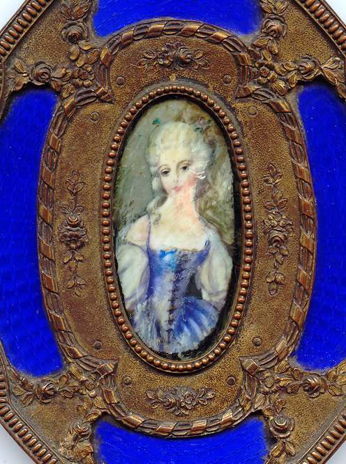 This is one of the finest hand mirrors I have had the privilege of owning. It is quite heavy and made of French bronze with cobalt enamel guilloche done in pique-a-jour around a center vignette of a hand-painted portrait on ivory of a lovely young woman. The painting is mounted beneath glass. The bronze handle of the mirror is done in pierced floweres and there is a rich filigreed bow with cascading ribbons on the top of the mirror. Mirror itself has a nice wide, shaped beveled edge. There is some cloudiness to the silvering itself but it is still fine for use. Measures approximately 15" high x 4-1/2" wide. Mirror itself is 5-3/4" x 4-1/2". (Click on pic for more photos.) |
