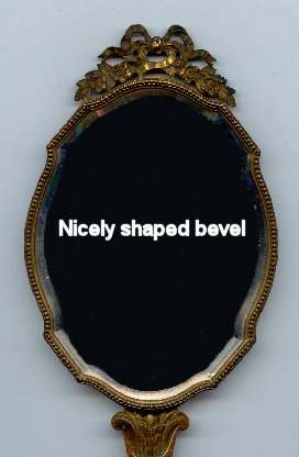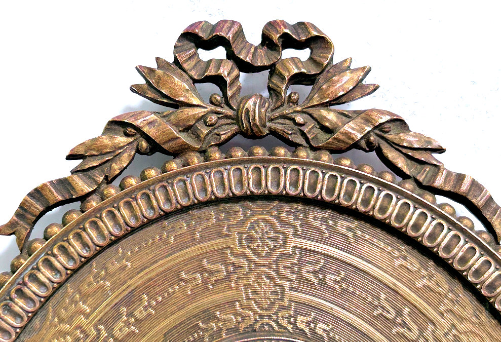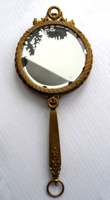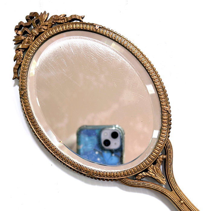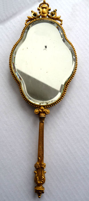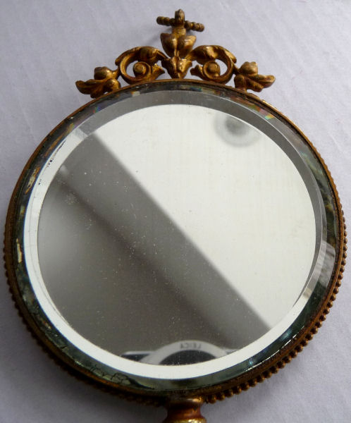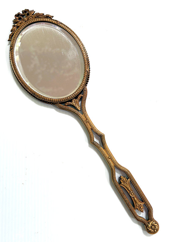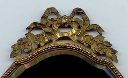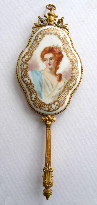 This is an absolutely gorgeous French bronze very ornate hand mirror that is one of the biggest I have seen ... from tip to tip it measures almost 15"!! It is extremely fancy with a 3-dimensional ribbon bow at the top and exquisite flowers and designs in concentric circles around the portrait. And what a portrait! I believe it is of Marie Antoinette and is beautifully hand-painted on ivory beneath a slightly convex glass. The handle is openwork with ornate designs on both sides. The mirror itself is beveled and is in pretty good condition ... totally clear and usable even though there are some scuff marks at the very top that doesn't interfere with image. Overall it is just an amazing mirror. The mirror portion itself (not counting bow or handle) is 5-3/8" x 4-1/2" overall. The portrait portion is 3" x 1-7/8" overall. It is stamped "France" on the handle.. (Click on pic for more photos.) |