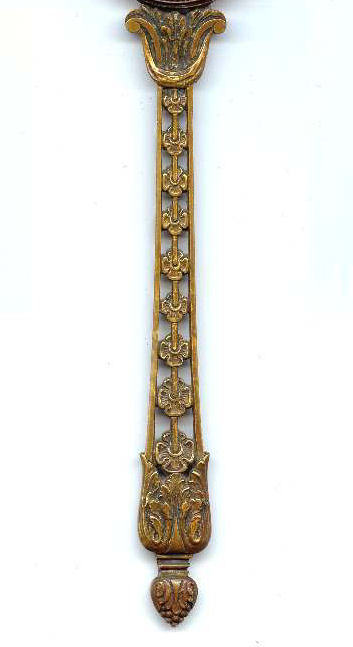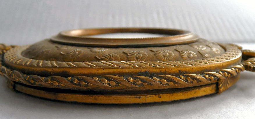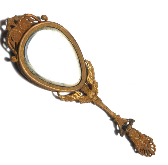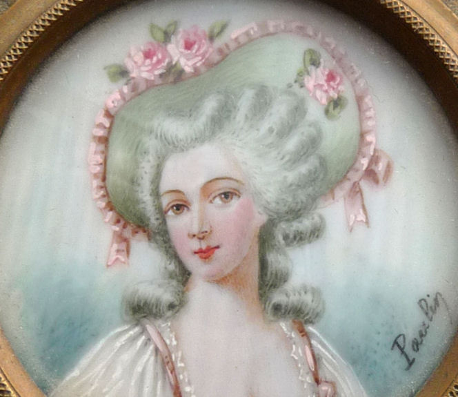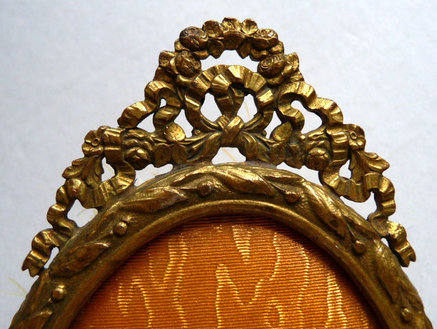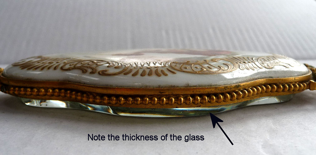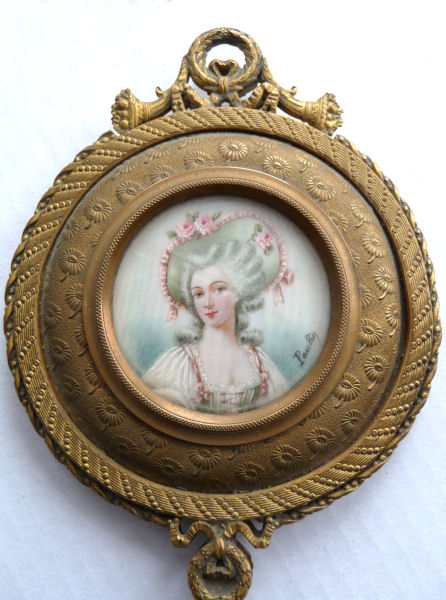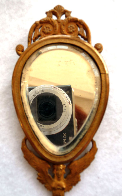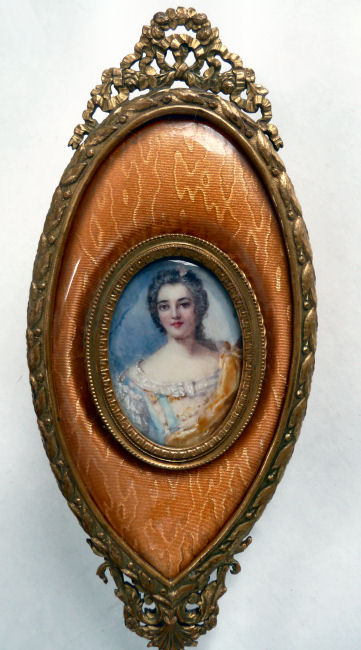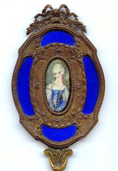 Believed to be a young Marie Antoinette, this beautiful little mirror appears to be French bronze (not marked). The portrait is signed Paulin and is most likely done on ivory although I have not taken it apart to verify this ... I don't want to bend the clips as they could break so I am going by my experience with such items. The mirror is quite heavy for its size and very ornate. The actual mirror is beveled but has extensive silver loss around the edges that is readily visible in the pictures; however, the center portion and all else that is not loss is clear and excellent for viewing. Original patina ... I do not polish these as the patination adds to its value. There is a tiny ring on the bottom to hang ig or even attach it to a chatelaine if such were the owner's desire ... I am not really certain of its purpose. Measures 8" long from tip to tip; round mirror portion is 3-3/8" 'diameter; mirror itself is 2-5/8" diameter. Mirror portion is 1/2" deep. (Click on pic for more photos.) |
