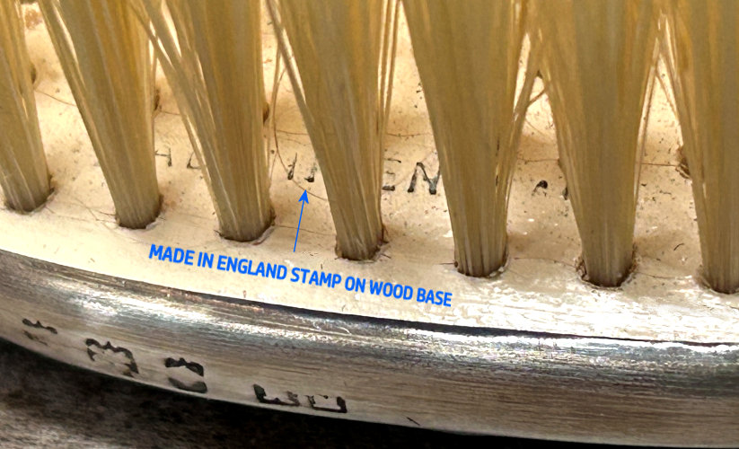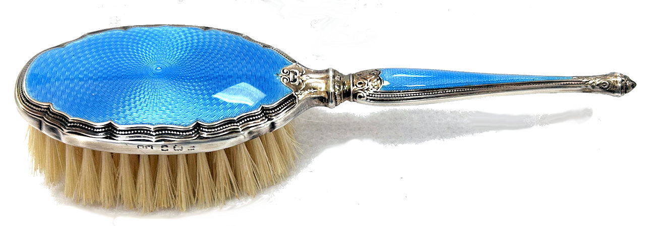 This is one of the prettiest hairbrushes I have ever owned. The silverwork on it is exquisite and was made by the Henry Matthews silversmiths who worked in Birmingham, England, from 1850 through the 1920's. It is finished in a lovely shade of baby blue enamel guilloche on the back and the handle and it is in absolutely mint condition. It is in its original box and would have come with a comb but it is no longer there. This is a small size brush which would either be for travel or for a child as it measures only 7" long end to end and is a bit under 2" across. It is hallmarked for Henry Matthews on the edge of the brush portion. The natural bristles are held in wood which has a stamp Made in England on it. I don't believe this has ever been used as I see no evidence of any hair whatsoever in the brush. There is also a tag on the bottom of the box that I don't know what it means but have taken a photo to show it. (Click on pic for more photos.) |