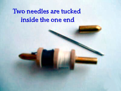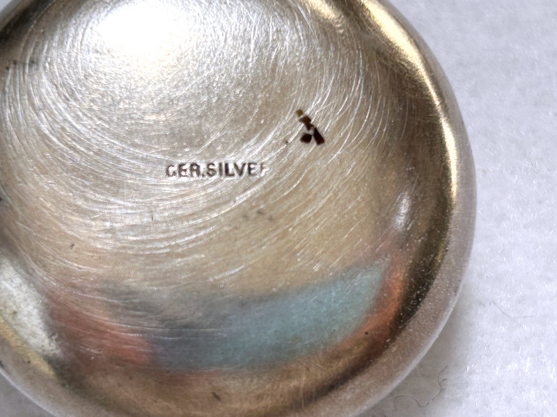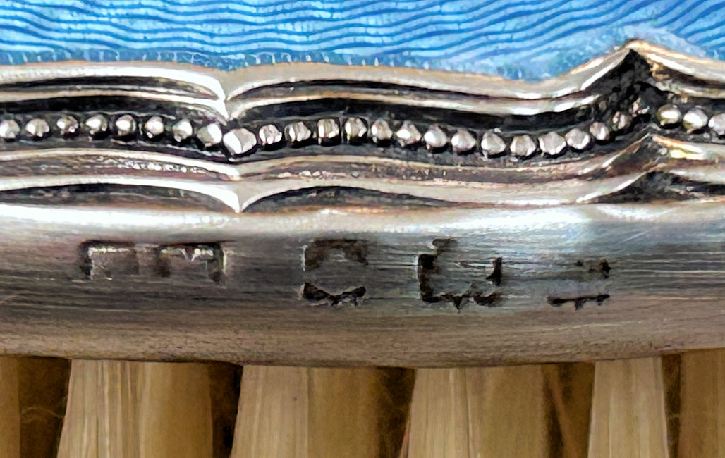 This is such a pretty accessory for any seamstress! The lovely sterling silver with blue enamel guilloche case will hold either needles, pins, or tailor's chalk. A piece of tailor's chalk was inside when I purchased it ... it fits like a glove so I am leaving it with the piece. Marked "Germany Sterling" on top of cap. There is one small chip on the rim where the top meets the bottom. I will add a picture of this shortly. Measures 2-1/4" long x 3/8" diameter. (Click on pic for more photos.) |
