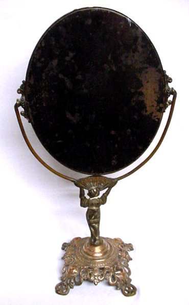 This love cast iron vanity mirror has a lovely copper bronze patinated finish and dates from the late 1800's and was made in Chicago. The mirror is beveled but is clouded over as seen in photo (it does look much worse in picture than it does in person). This was probably made for the World's Columbian Exhibition in Chicago in 1893 and the figure is more than likely that of Columbia. One of the legs has a very early repair that is reinforced from beneath ... very nicely done. The mirror itself measures 8" wide (9-1/2" at outside hinges) x 10" high. The base measures 5-1/2" square. The overall height is 18". (Click on pic for more photos.) |