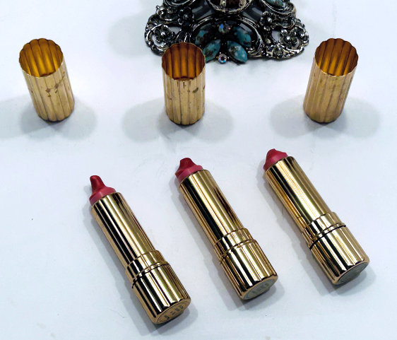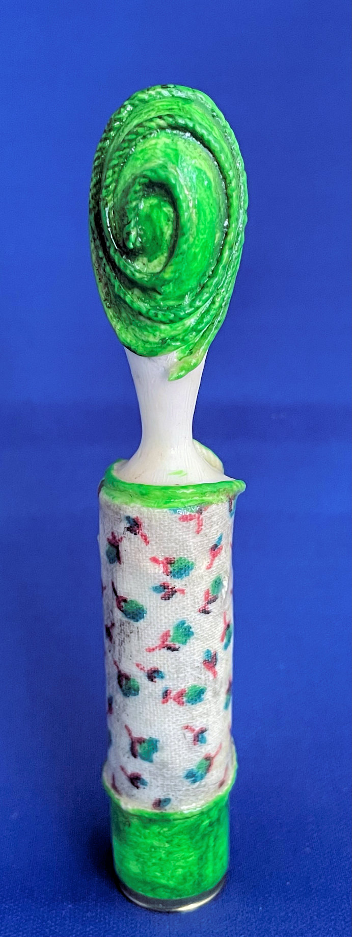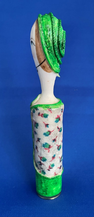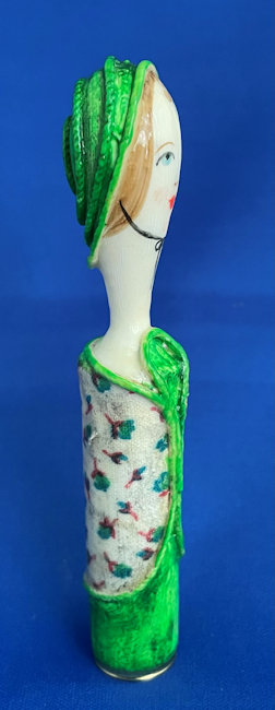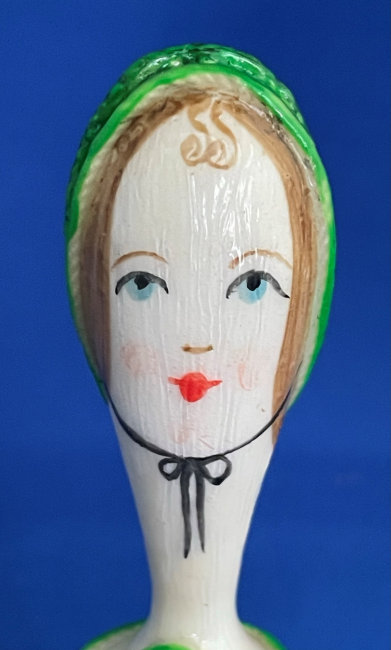 This is such a cute little lipstick cover which is a total mystery to me as I have no idea where it came from or what it is made of! I bought it way back in 2004 simply because I adored her sweet face. It appears to be hand-made; in fact, when I purchased it I was told it was paper maché. It has hand-painted features on the face and the flowers on the tube portion. The tube itself is brass and is unmarked. I always displayed it standing on a shelf where I could enjoy her sweet face. It measures 4-1/4" tall. The tube is 5/8" diameter at the open end and the length inside the tube is 2". No damage that I can see although there appears to be some discoloration on the cream surface which I have not attempted to clean. It may bleach out, I'm not sure, but I prefer to sell it as-found and leave that to the next owner. (Click on pic for more photos.) |