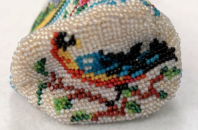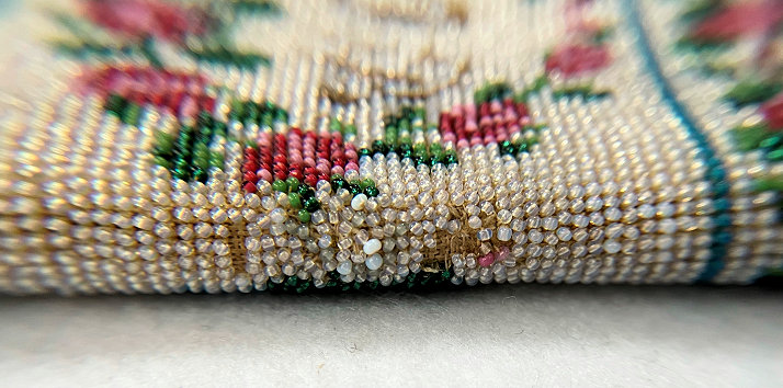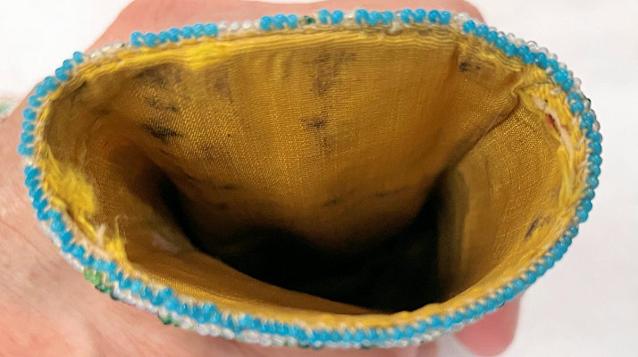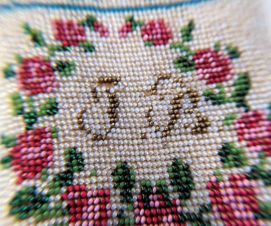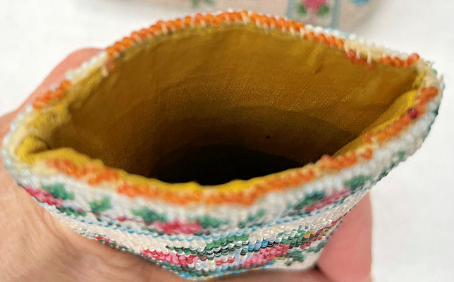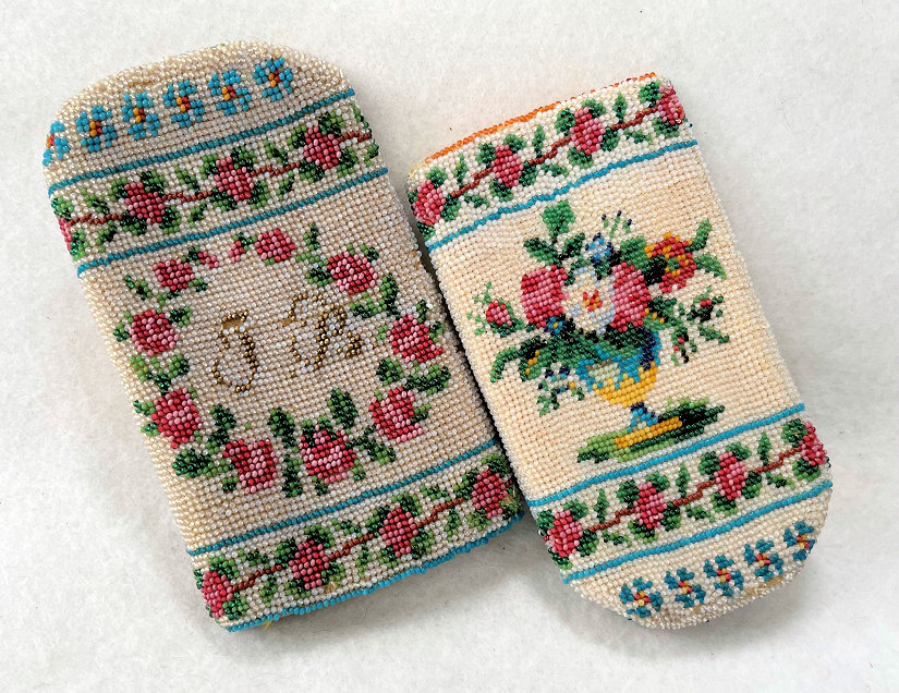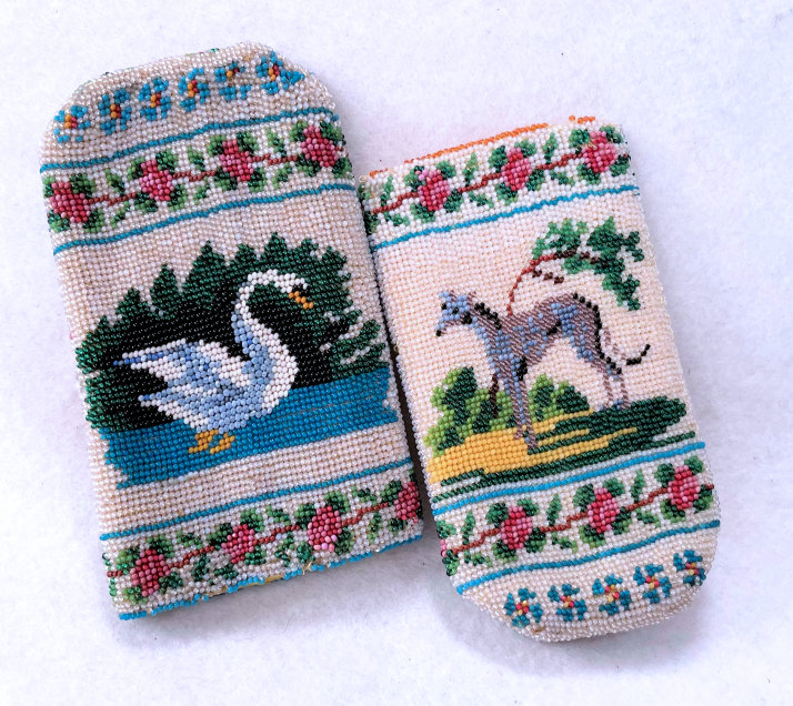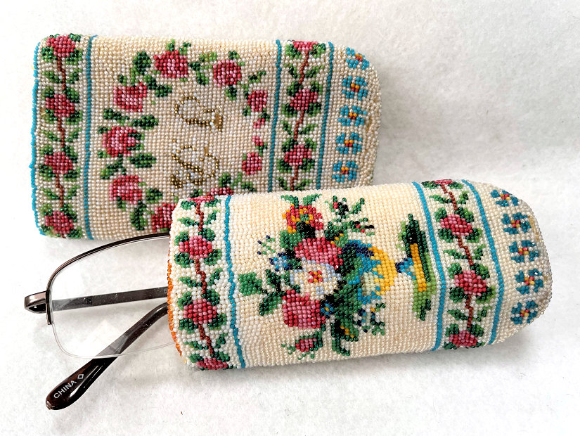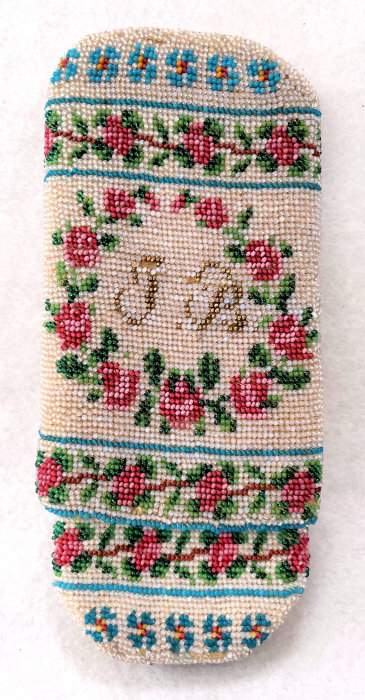I have had this beautiful micro-beaded eyeglasses case in my collection since 2005 and I have always loved it. But it wasn't until I was photographing the case today for the site that I noticed there are birds on either end as well! I had only seen the swan and the greyhound on the inside! So imagine my delight when I realized it was a 4 figured case in addition to the vase of flowers and the wreath with the initials inside. I am dating it to the mid-1800's due to the method of construction and design of the beads but it could be even earlier. The bottom and top of the case fold flat and expand outward when glasses are inserted. The outside of the case has a swan on one side and a wreath of roses with the intials T.B. or J.B. on the other. The other half, which slides out from the outer half, depicts a greyhound dog on one side and a vase of flowers on the other. The beads on the inside are a brighter white and this could be by design or it could be that the outside has faded over the years. The inside is lined in a dark gold fabric which is original. There is some type of a semi-rigid stabilizer in each half to keep the case shape. It is a very rare and very amazing item and one you will be hard pressed to find again. Yes, it's expensive but I paid a lot to get it even back in 2005 and I believe it is worth every penny. It is in fantastic condition for its age with only a small area along one side with some bead loss, a few missing in the letter T or J, and a bit around the open edges of each half (these will all be clearly shown in the photos). Enjoy the pics ... you'll never see another like it! Outer half measures 4-1/4" high x 2-5/8" wide. Inner half measures 4" high x 2-1/4" wide. When tucked together they can be closed to 4-1/2" high. When opened at each end, they expand about 1-1/4". (Click on pic for more photos.) |