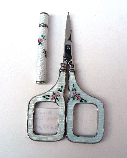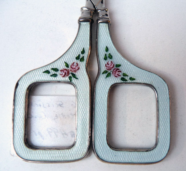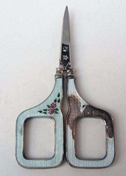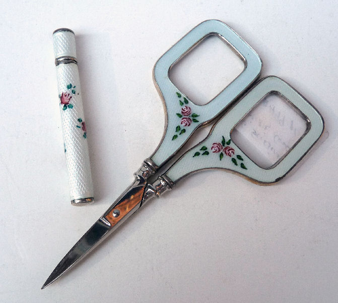 This is such a pretty accessory for any seamstress! The lovely sterling silver needle case and scissors are done in a pale pale blue enamel guilloche case with hand-painted pink roses. There are markings on the needle case for sterling but I was unable to capture them in a photo as they are simply too small. The scissors are not marked but are usually stainless or some other stronger metal for the blades and sterling on the handles. Needle case is in excellent condition but the scissors do have damage on one side. Please see photos for accurate condition. Needle case measures 2" long x 1/4 " diameter; scissors are 3-1/2" x almost 2" wide. (Click on pic for more photos.) |