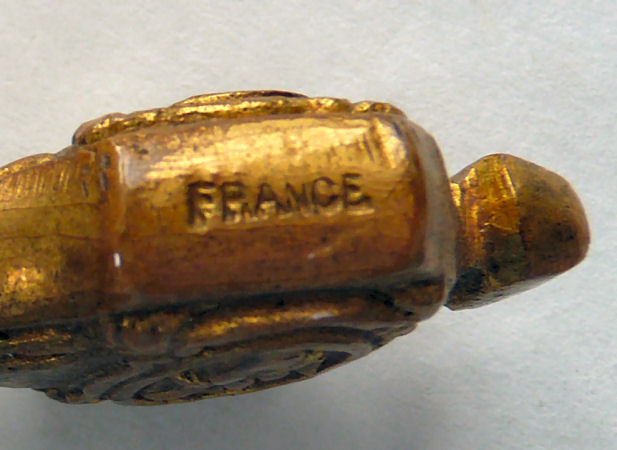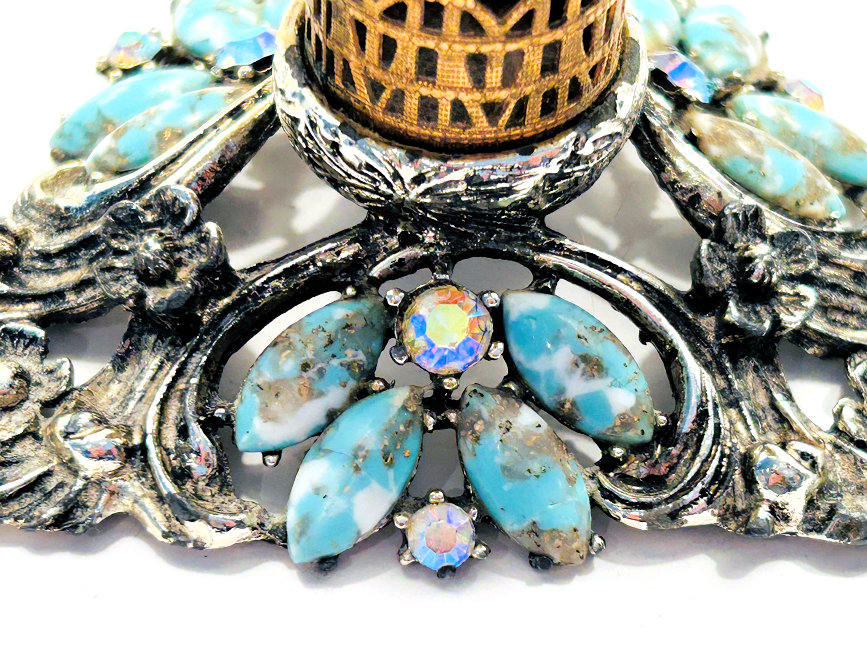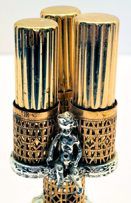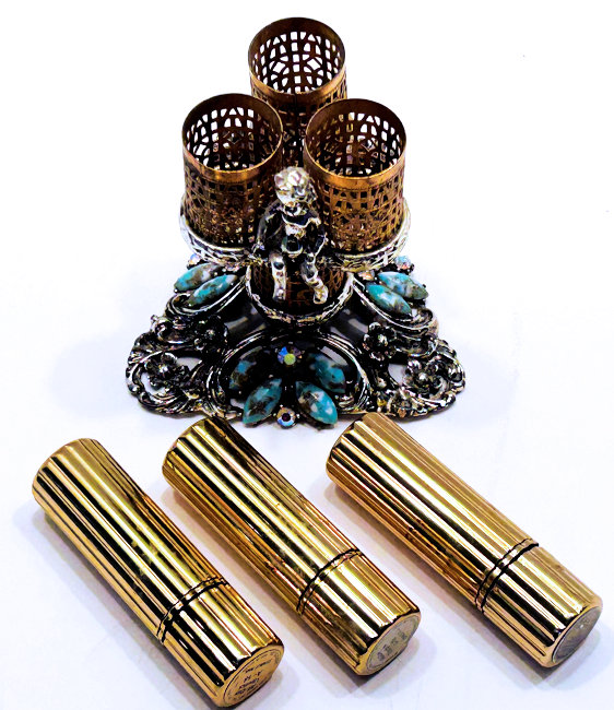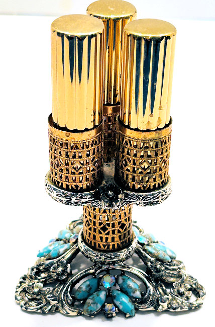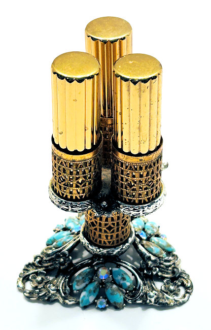 This lovely lipstick caddy was made by Sam Fink, probably from the 1940's or 50's. The trademark Sam Fink design is a cherub which adorns a lot of their designs. The base on this one is filigreed with rhinestone and turquoise jewels. Floweres adorn the bottom as well as the sides opposite where the cherub sits. The caddy holds three lipsticks, all by Estee Lauder with traces of old lipstick still inside. This could be easily removed and your own lipstick added to the tubes. The bottom and base of holders are silver tone metal and the columned holders are gold. All stones are intact and there is no damage other than some patination and marks which look worse in pictures ... in person they look great. I have no attempted to polish or clean as most people prefer original patina to the brass. The stand itself measures 3-1/4" wide on all three sides of the pedestal x 3-1/4" high to top of holder. The lipsticks themselves are 2-3/4" high x 3/4" diameter. Overall height total is a bit under 5". Please view all the photos as I have taken numerous close-ups. It is signed SF in a lozenge under the base (sorry I didn't get a picture of that but will try to get it uploaded shortly). (Click on pic for more photos.) |