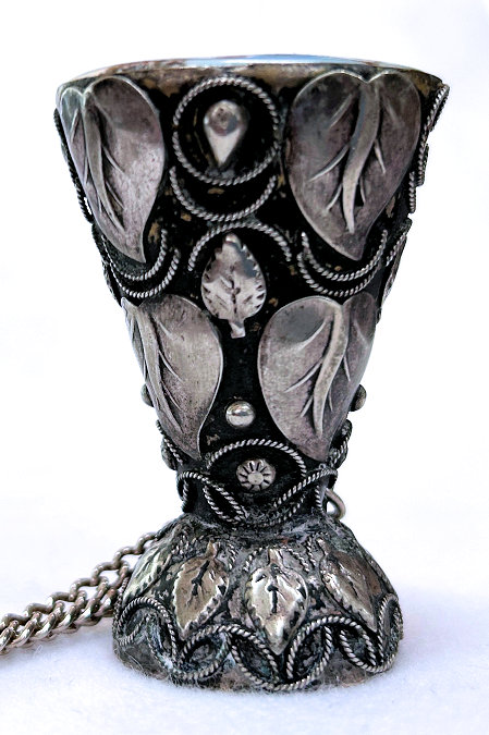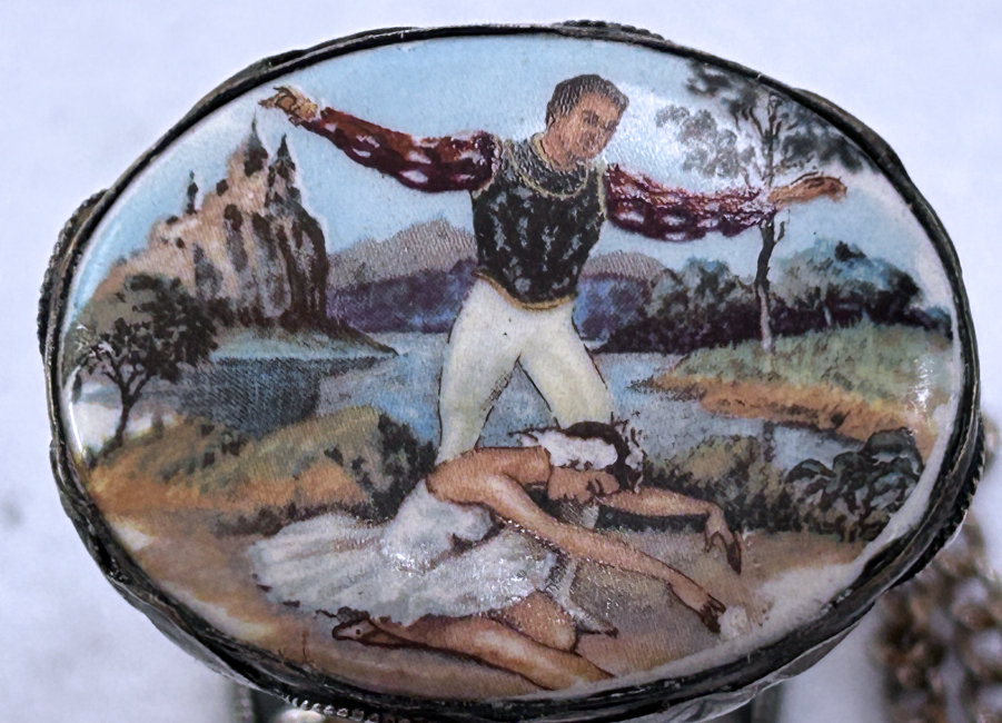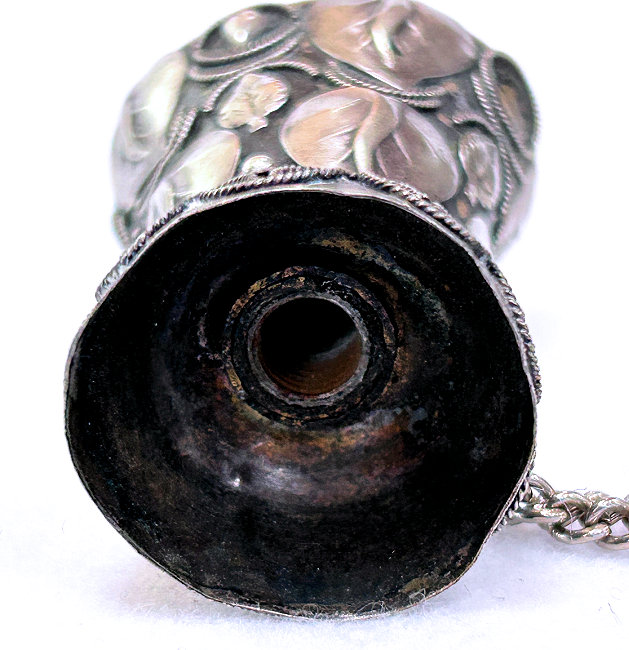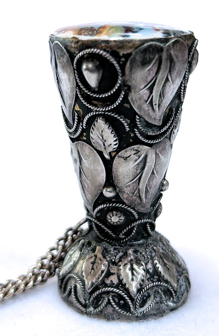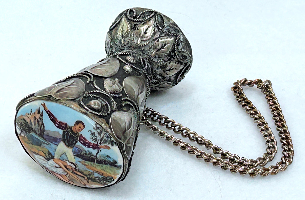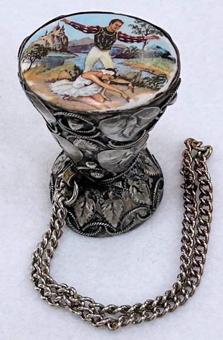 This is a rare and beautiful Victorian tussie mussie that has been a prize of my collection for many years. I am not sure what it is made of because I cannot find a marking, but the designs on the holder are very ornate and detailed. It has a little chain handle for carrying. What makes this one so rare -- and I have never seen another like it -- it the hand-painted scene of a ballerina, a gentleman, and a lake and castle in the background. Just stunning and displays perfectly on its end. It does tarnish and polish with a light buffing so it may be silverplated. This little beauty measures almost 2-1/2" high. The scene is 1-1/2" x 1-1/4". The holder end is 1-1/4" diameter. The chain handle is 5" long. (Click on pic for more photos.) |
