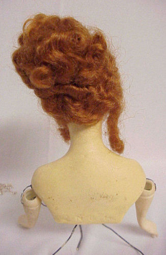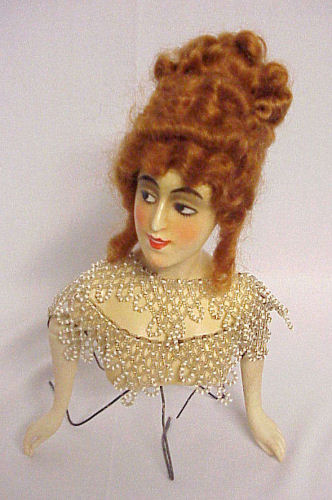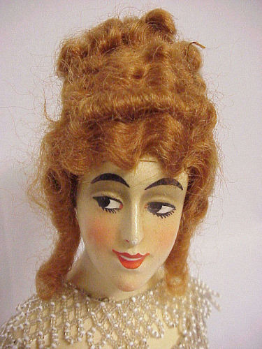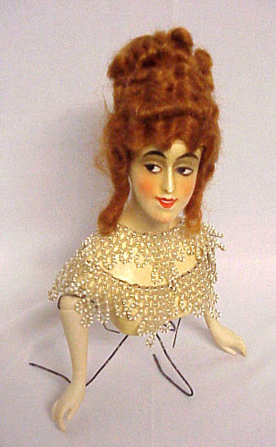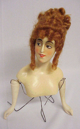 Wow! Such a pretty wax half doll with beautiful red mohair wig with tons of curls! This pretty lady is the perfect size for your dresser or vanity ... just stands 5" tall (not counting wires or hair). Her painted features are in excellent condition and the porcelain arms are also in great shape ... left pinky finger is missing the tip. As for the wax, the only damage I can see is the very tip of her nose is missing just a wee bit ... it is very hard to see except in the supersized close-up. In person, it's unnoticeable. This pretty lady came without clothes but I had a beaded trim collar that I draped around her for the photographs. It is signed on the lower back but I can't make out the letters. She could be dressed in a period costume and finished as a large pin cushion or even made into a doll with a bottle body or whatever suits your fancy. If you would like the beaded collar, I would include it for an additional $50. (Click on pic for more photos.) |