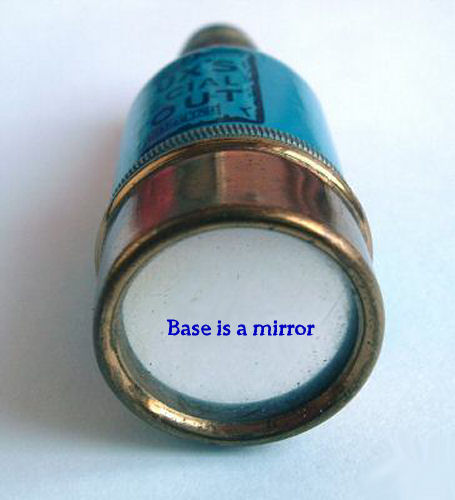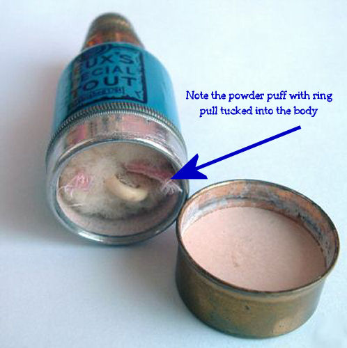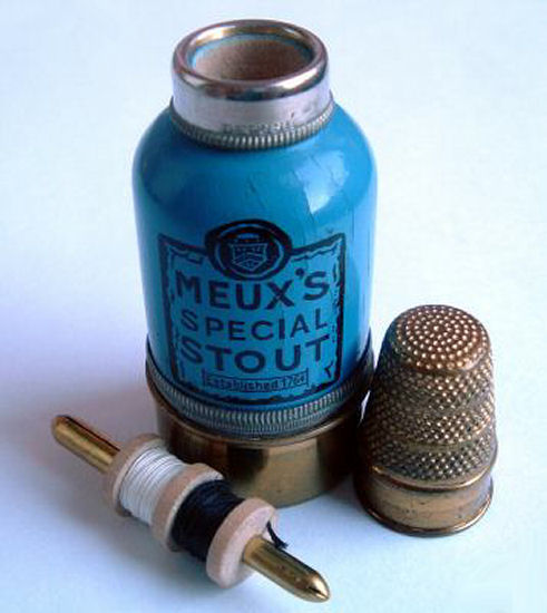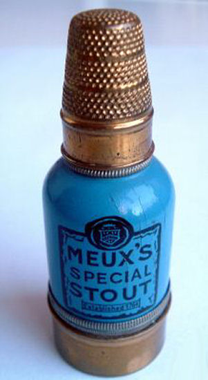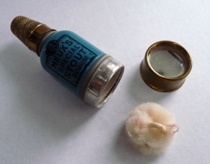 This is a very favorite collectible that I have had for many years now ... it is a combination etui (fully loaded!) and compact in a novelty bottle-shaped container derived from the famous Meux's Brewery which was founded in London in 1764. The mechanics of this are delightful ... the lid or cap is actually the thimble beneath which is a removable spindle which holds two thread spools. One end of the spindle has a removable cap which reveals a compartment to hold needles (2 are still inside). Now for the really fun part! Turn it over and you will see yourself in the mirror on the bottom ... but that's not all. The bottom portion is also removable and inside can be found a powder cake in the "cap" and tucked inside the bottle portion is the sweetest little puff you ever saw ... complete with tiny ring handle and ribbon remnants. I have never seen another like this anywhere ... it is truly a rare piece and a crossover collectible for sewing afficianados also. Measures 1" diameter at base x almost 3" tall. Marked "Depose" on the neck ... English origin. (Click on pic for more photos.) |