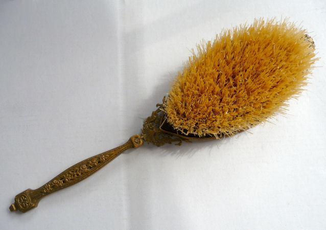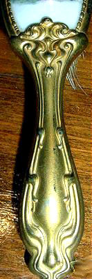 I am not sure who the lovely young woman is who was immortalized on this French bronze brush, but she was hand-painted on a thin sheet of ivory and signed by the artist whose name has faded with time and is not legible any longer. The workmanship on this lovely brush is superb as most of the French bronze pieces are. The portrait is set in a framed oval which is separate from the guilloche. And the enamel guilloche is a lovely shade of pale orange or peach with a moire pattern in the guilloche. At the top of the brush is an openwork ornate ribbon bow with roses above. The handle is also done in openwork on both sides and is stamped France on the very tip. The natural bristles in the brush are all intact and in good condition. This is a beautiful piece in excellent condition. Measures 12" long from tip to tip; brush portion is 5-1/2" x 3" not counting the ornate topper. (Click on pic for more photos.) |