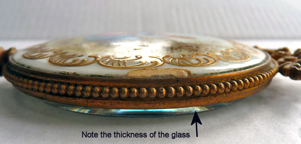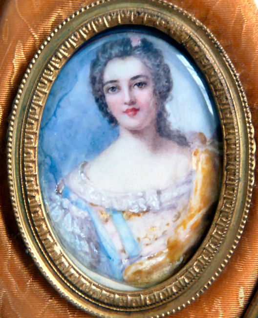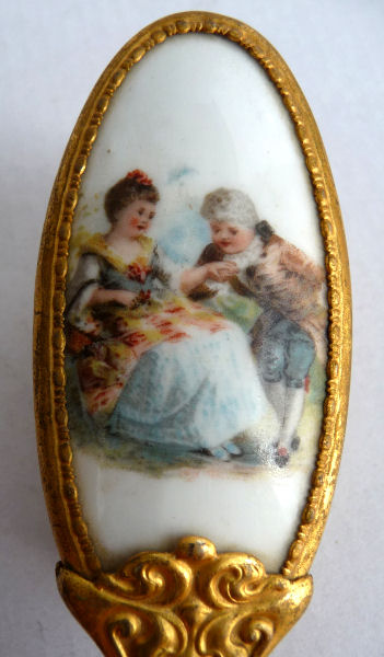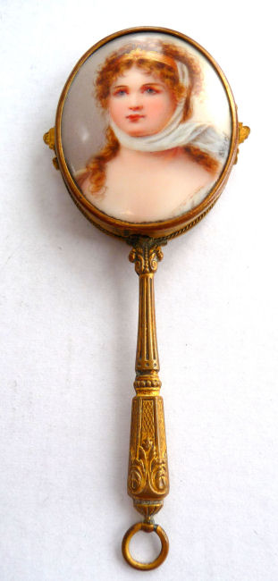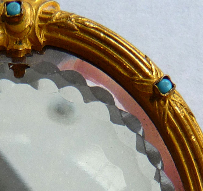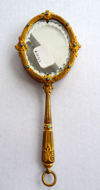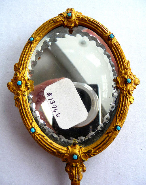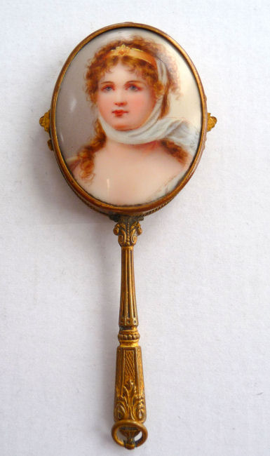 This is one of the finest chatelaine mirrors I have ever owned ... it not only has a beautiful hand-painted portrait of a lovely young woman (thanks to a customer's information, I now know this is Queen Louise of Prussia, who died at age 34 in 1810), the reverse side has the most exquisite cut and beveled glass mirror surrounded by turquoise jewels. You just have to look at the pictures (which don't do it justice). The painting is done on porcelain and the artist has signed it but I cannot make out the name. The close-up photo will show it as clearly as I can see it. There is a tiny ring at the bottom of the handle for attaching to a chatelaine. Now for the mirror itself ... it is beveled and the edge of the bevel is cut in tiny scallops all the way around which makes it sparkle like a jewel. And there are jewels -- turquoise ones -- set around it in tiny bezels. There are 8 of them around the mirror and one more in the handle. The metal itself is either brass or bronze ... I am not an expert in this but it does have patination and is quite lovely in its own right. Again, the pictures will show this in greater detail than I can describe it. The mirror portion measures 1-3/4" wide x 2-1/4" high. The overall length of the mirror is 5-1/4" from the tip to the bottom of the ring. There are little decorative embellishments that protrude from the sides and top of the mirror (again, see pics). (Click on pic for more photos.) |