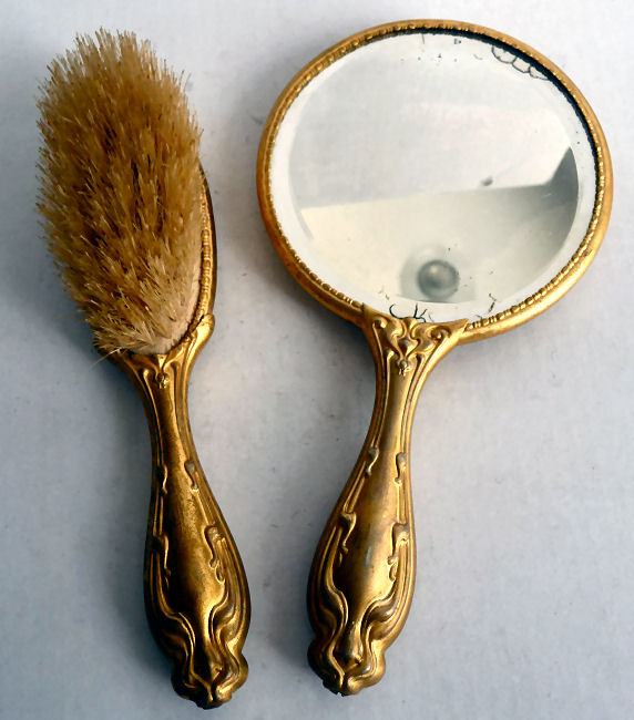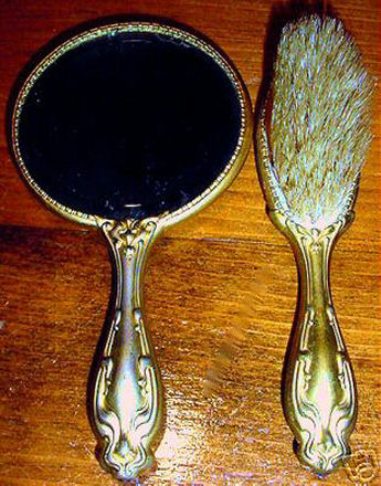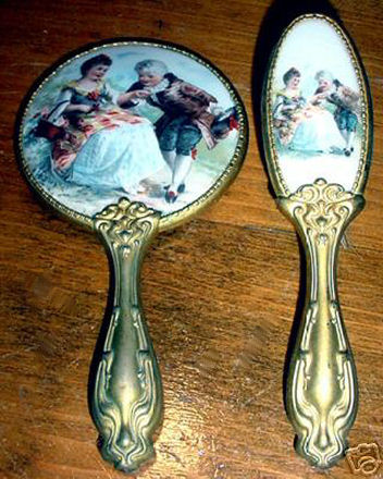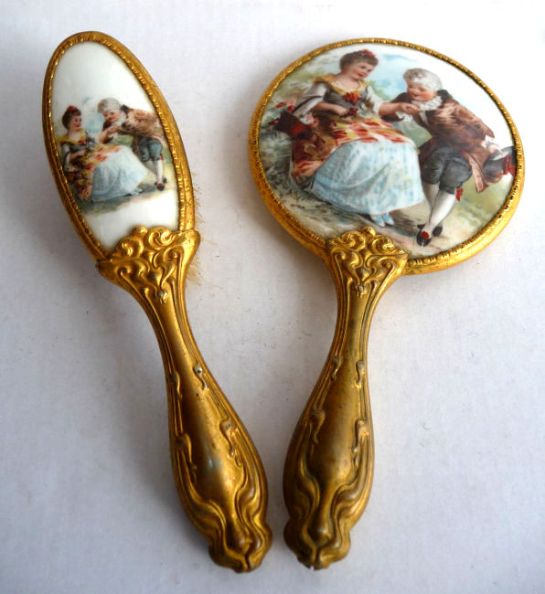 The figures on this adorable little child's set look like children playing dress-up to me. The scenes are done on porcleain and both are the same with only subtle variances. The metal surrounds are not sterling or even brass but rather a white metal base with gold wash over them which has worn on the high points. The brush is natural bristles and the mirror is nicely beveled. It is in very good condition with a few age streaks at the top and bottom edges under the bevel but the center portion is clear and good. This is a very cute set that was meant for a child and shows that it was dearly loved by one. Mirror measures just over 6" long and 3-1/4" diameter at top. Brush is 5-3/4" long x 1-3/8" wide. (Click on pic for more photos.) |