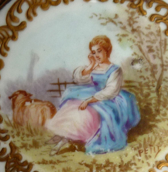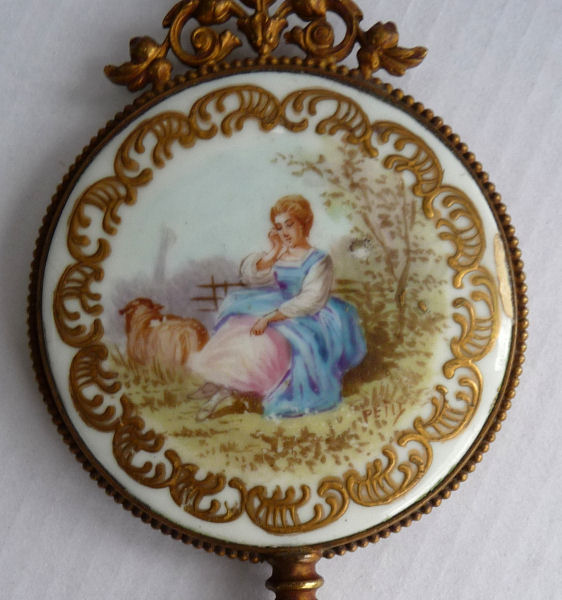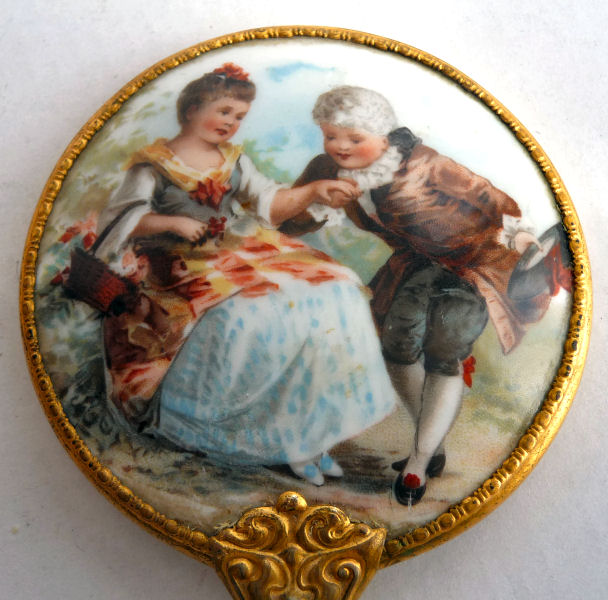 This adorable little French mirror is smaller than the ones above but just as stunning to see. This one features a pastoral scene of a lady in full gown seated on a bench with a sheep resting beside her. It is done on porcelainand is signed simply "Petit". There is rich gold embellishment around the edges and beaded trim on the outermost edge. Very fanty ornamentation tops it with a little beaded hanging ring. It is a darling piece! The mirror itself is deeply beveled and is in excellent condition. . Measures 6-1/4 " long from tip to tip; round mirror portion is 2-3/4 " 'diameter x 1/2" deep. (Click on pic for more photos.) |