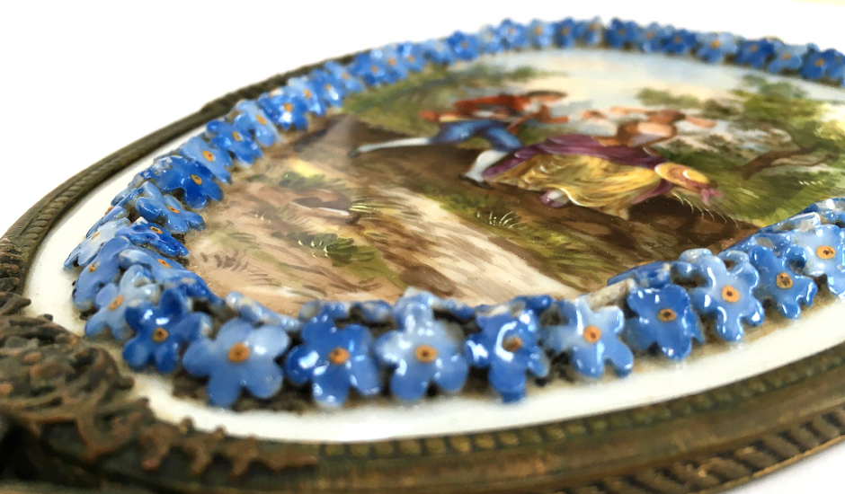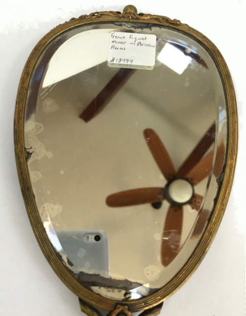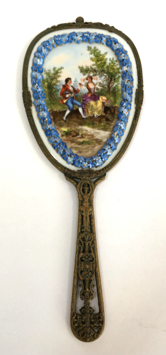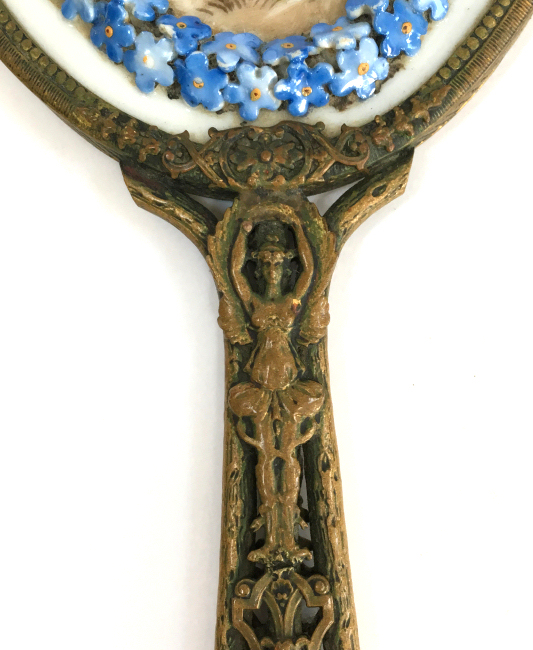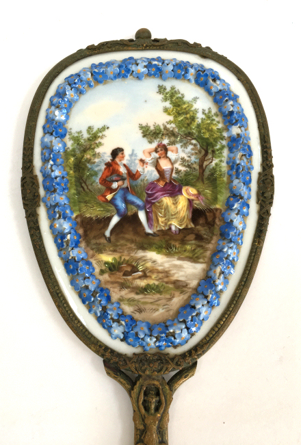 This is an extraordinary hand mirror done in French bronze with an ornately detailed border of 3-dimensional porcelain flowers bordering a hand-painted courting scene. In all my years of collecting, I have never seen another like it. The scene on the back is quite large and has exquisite detailing down to the laces on her bodice and ribbons on her hat. And And the handle on this one is equally spectacular with a full figured ballerina on both the front and back. The handle is also openworked to give it even more appeal. The mirror itself is nicely beveled with some foxing and a crack at the very bottom. It is still perfectly usable and clear enough that it reflects a perfect image. What a gorgeous piece! I am unale to find any markings on it but it was purchased as French bronze where I bought it and I did not want to take it apart to look for markings inside. It is similar enough to other French bronze pieces of the era that I am satisfied that it was made in France. Measures12" long x 4-1/2" wide overall. Mirror portion itself is 4-1/2" x 6". (Click on pic for more photos.) |