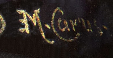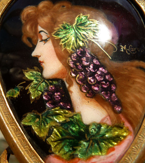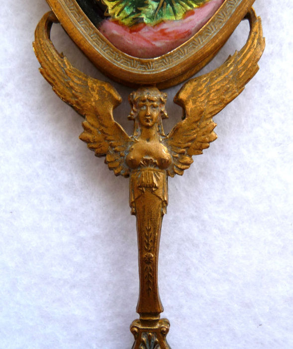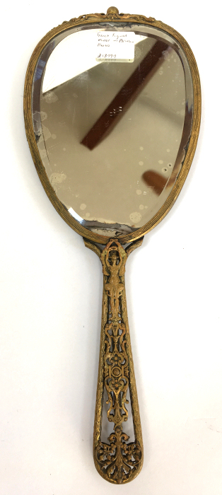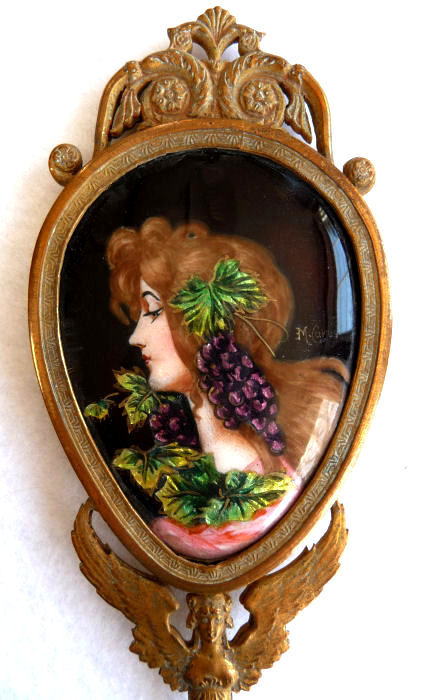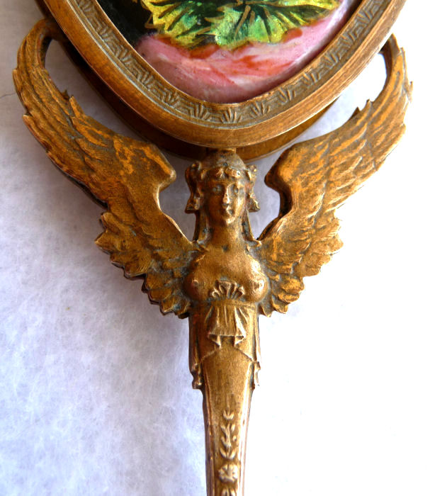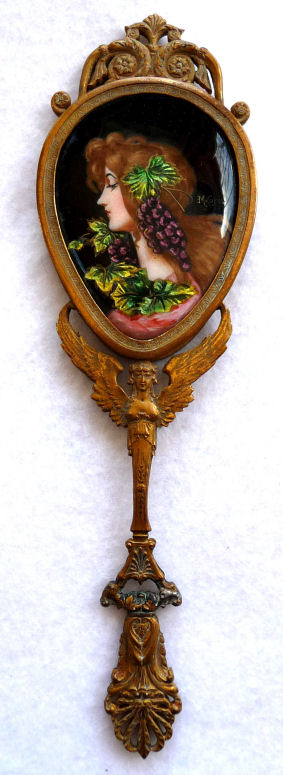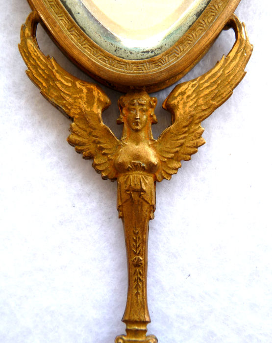 This spectacular miniature hand mirror is perfect for stashing in a travel bag or purse although it is really rather too nice for such use! The beautiful mirror features a hand-painted beauty on the front with foliate leaves adorning her hair and dress which sparkle in the light. It is artist signed M Carus on the right side. The painting is in excellent condition with no chips or damage whatsoever. The handle of the mirror features a nude winged goddess (Nike?) on both sides. The mirror is beveled and has some foxing from age but it totally usable as it is. The base metal is made to look like bronze but I believe it is either brass or spelter with a gilt coating. Although it appears to be French, I cannot find any marks to confirm it but it was sold to me as such by a reputable auction house. Please view all the pictures to see how exquisite this piece truly is! Measures 2" wide x 6-3/4" overall. Mirror portion itself is 2" x 2-1/2". (Click on pic for more photos.) |