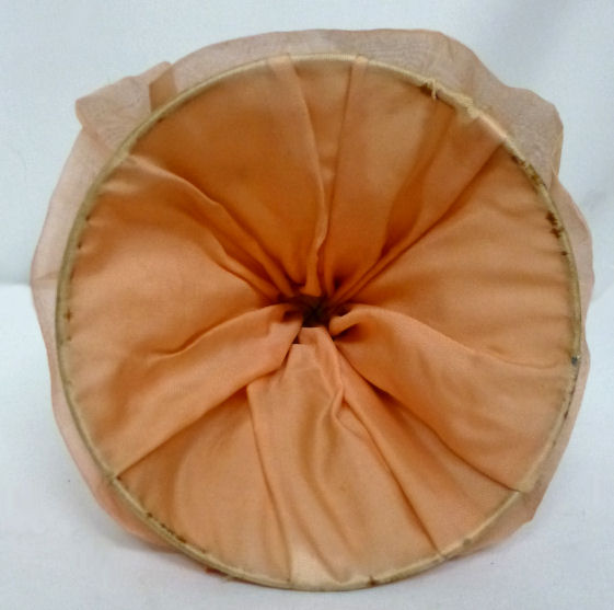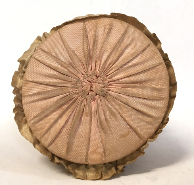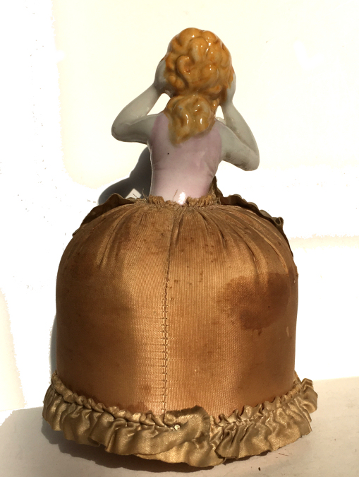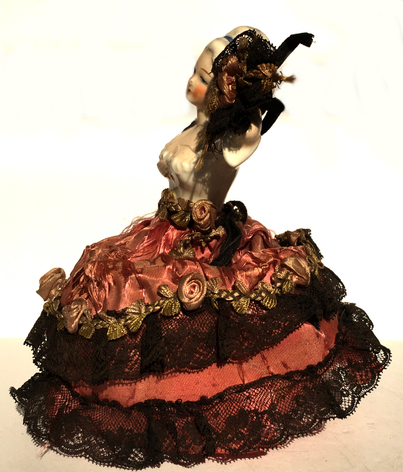 This is a really lovely pin cushion porcelain half-doll in a striking pose with both arms raised and a rose on her shoulder. This lovely lady is wearing a pink topped dress with a taupe silk skirt with a lace overskirt and ruched ruffle trim. The same silk covers the pin cushion beneath. The porcelain doll is in excellent condition with no damage whatsoever. The skirt is perfect structurally ... there are some darkened spots on the lace overskirt that I thought were part of the design but upon closer inspection, there is actually a pin in each spot which has darkened it. Ironically it is so symmetrical that I truly thought it was a french knot! There is a dark spot on the back of the skirt (see pics) that I did not ever try to clean, so I can't say whether it would come out or not. I prefer to leave this in as-found condition myself. Measures 6-3/4" high overall x 4-1/4" diameter at base; doll itself is about 3" high. NOTE: All of the pincushion/dresser half dolls came from a local estate here in the Pittsburgh area that we purchased back in 2006. I am finally relinquishing them! :-) (Click on pic for more photos.) |