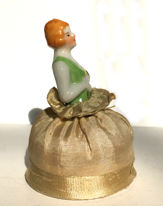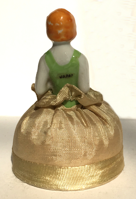Here is a cute little porcelain half-doll pin cushion in all original condition. She is in absolutely perfect condition with no tears, stains, or damage of any kind. Pincushion is in excellent supple condition as well. Both bottom and porcelain are marked "Made in Japan". Measures 3-1/2" high overall x 2-1/2" diameter at base; doll itself is about 2" high. NOTE: All of the pincushion/dresser half dolls came from a local estate here in the Pittsburgh area that we purchased back in 2006. I am finally relinquishing them! :-) (Click on pic for more photos.) |