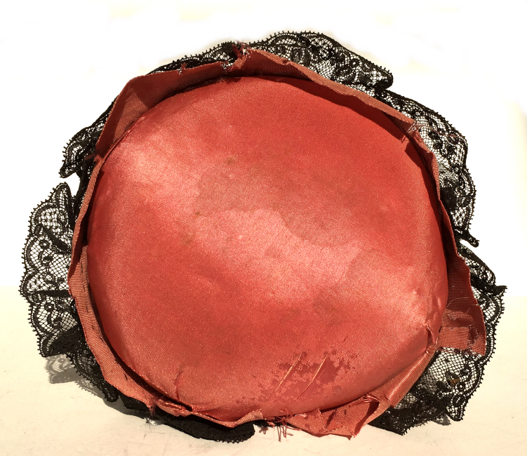 This is a really lovely pin cushion porcelain half-doll in a striking pose with one arm raised and a bouquet tied to her wrist. How this managed to stay intact after all these years is a mystery, but it is clearly original to the piece as it matches her gown exactly. This lovely lady is wearing a dark pink dress with silk ribbon roses around the waist and lower edge as well as two rows of black lace. The same silk covers the pin cushion beneath. The silk is shattered on the top but it is still totally usable. There is a faint mark on the bottom of the porcelain doll which I think says Germany but I can't get a clear enough look at it to be 100% certain. The porcelain is in excellent condition; there is a teeny little speck on the side of the tip of her nose which may be an air bubble in manufacturing or could be a miniscule chip (although I find it hard to believe a chip could occur here). In any event, it is truly insignificant and could easily be touched up with a teeny dot of paint if desired. I have kept it original as it doesn't bother me at all. Measures 6" high overall x 5" diameter at base; doll itself is about 3-1/2" high. NOTE: All of the pincushion/dresser half dolls came from a local estate here in the Pittsburgh area that we purchased back in 2006. I am finally relinquishing them! :-) (Click on pic for more photos.) |