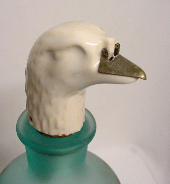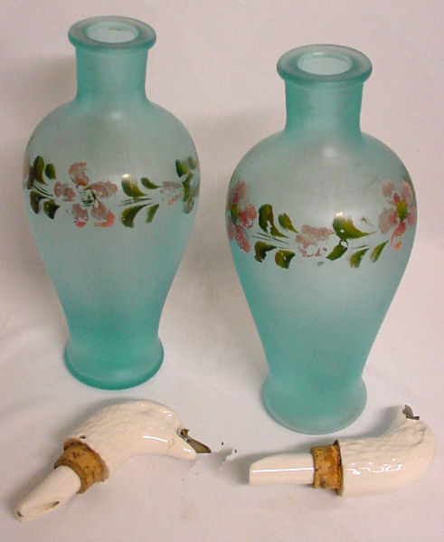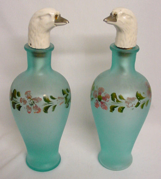 This is a beautiful pair of antique barber bottles with hand-painted flowers on blue satin glass. The porcelain tops are figural birds whose beaks have a hinged metal top that opens to pour. The bottles and tops are in perfect condition ... the hand-painted flowers show some wear as appropriate to age. Bottles measure 7-1/4" high to top of neck, 9-3/4" high to top of bird's head. (Click on pic for more photos.) |