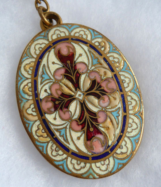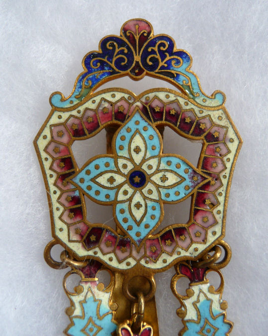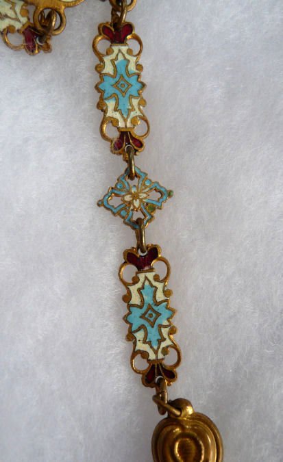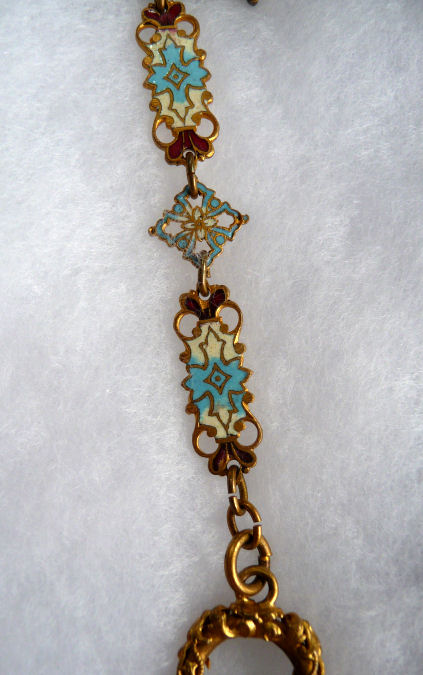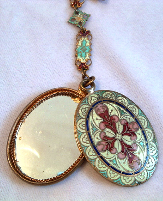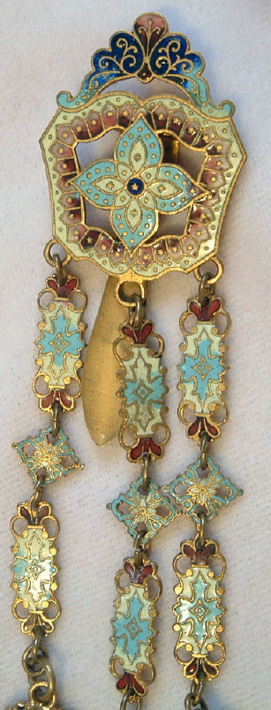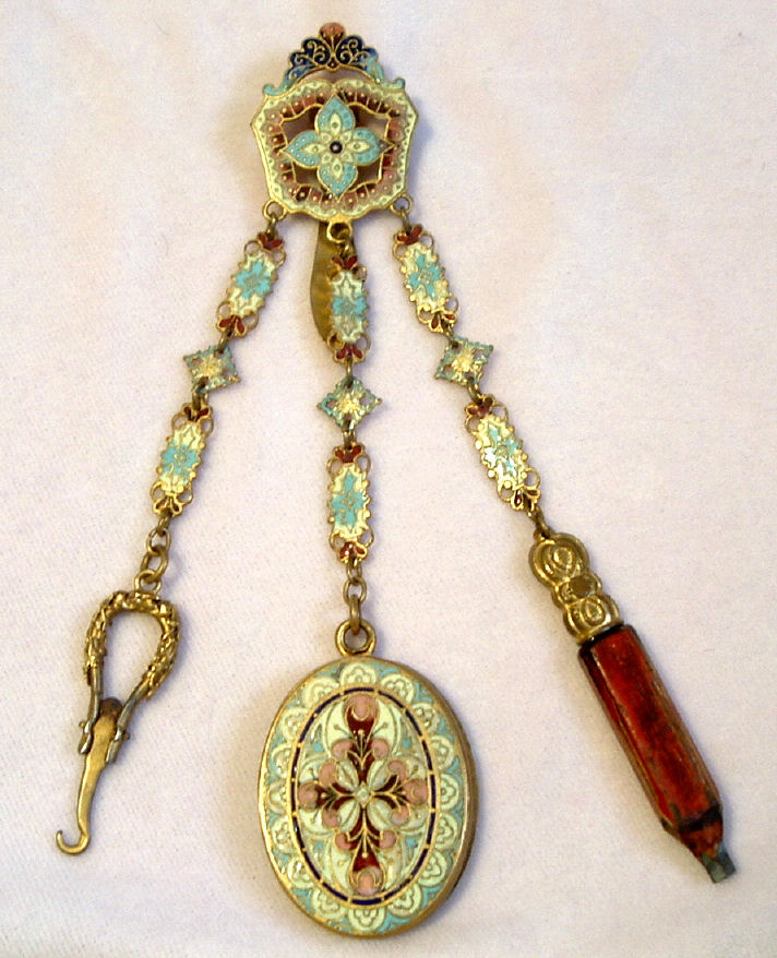 Very old and very beautiful, this champleve enameled chatelaine has such pretty feminine colors. Always a huge fan of pinks and blues when used together, this one truly speaks to my heart. I cannot pinpoint the exact age but my guess is 1870's or 80's. It was obviously much used and much loved as it has what appearsto me to be very early attempts to replace missing enamel on the mirror piece (close-up photos will clearly show this but at a glance, you will not notice it at all). The base metal is probably brass or an alloy of brass. It has 3 pieces attached to it: a very old wooden pencil with pretty holder which all appears to be original, a covered mirror, and a tiny button hook which folds closed. Chatelaines were the precursors of purses and gave a lady a way to carry items easily and decoratively. This one would have been a dressy one to wear out on an evening. Be sure to see all the photos ... there are many!