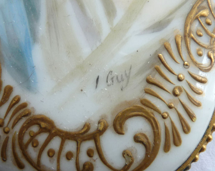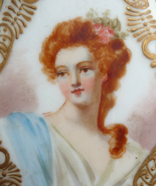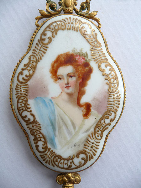 I am not sure who this lovely lady is but she has flowing red locks and a peaches and cream complexion all done on porcelain. The portrait is signed I. Guy in the lower right and there is rich gold embellishment all around the border. It is just stunning! On the outermost edge is beaded trim and the top has ornate detailing with a beaded hanging ring. The mirror itself is beveled and is in excellent condition with only a few age foxing spots visible in pics. The mirror is clear and reflects a good image. It is a stunning piece! Measures 8-1/4" long from tip to tip; mirror portion is 2-3/4" wide x 3-3/4" high x 1/2" deep. (Click on pic for more photos.) |