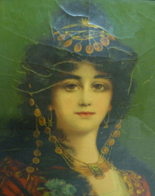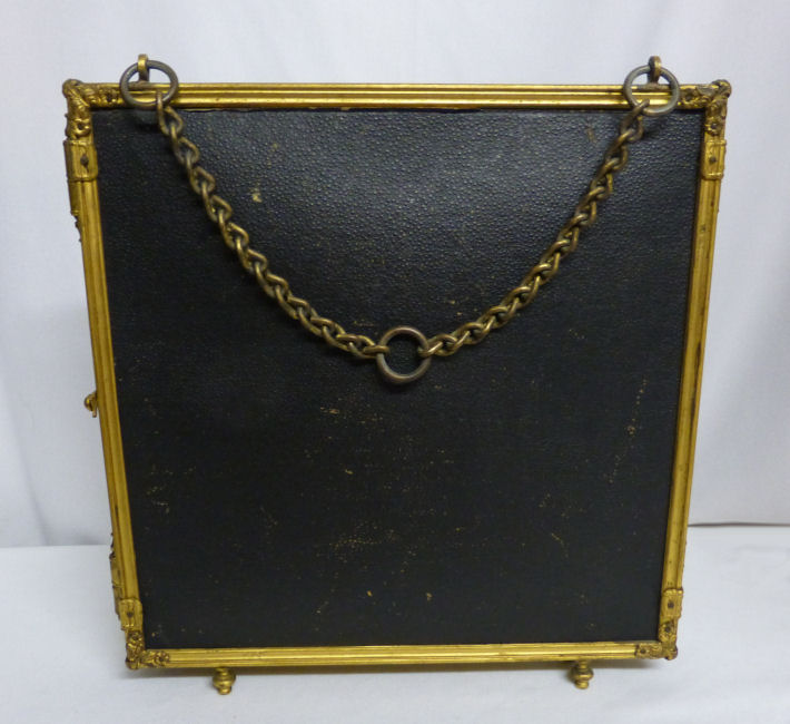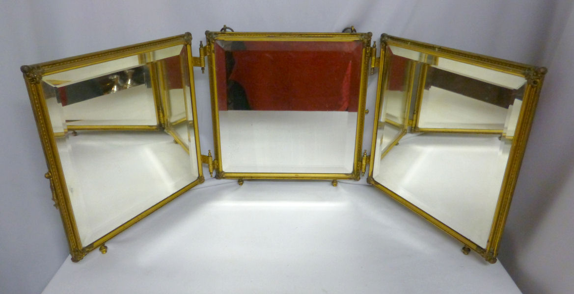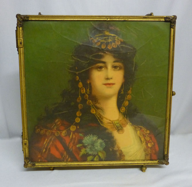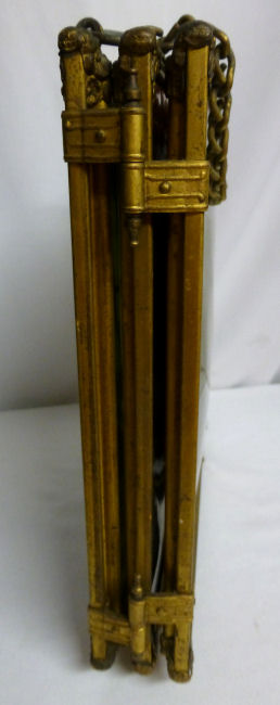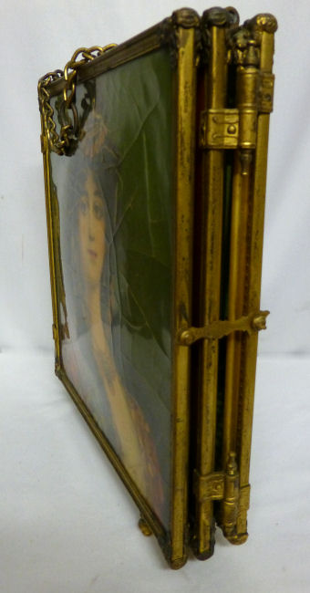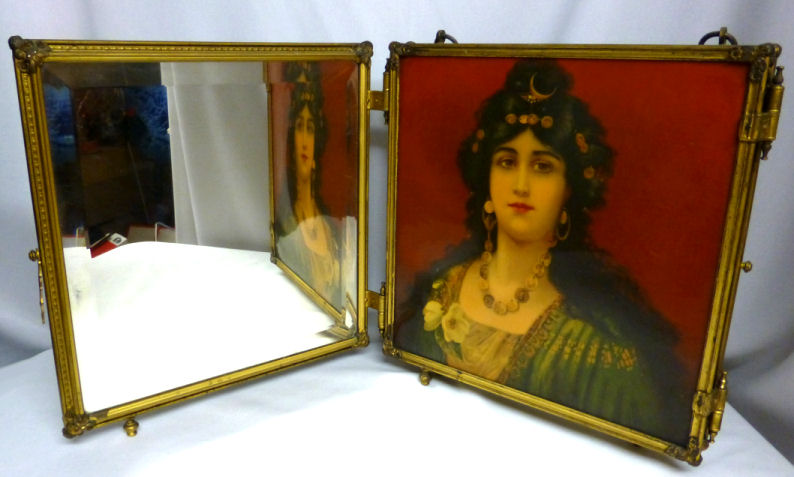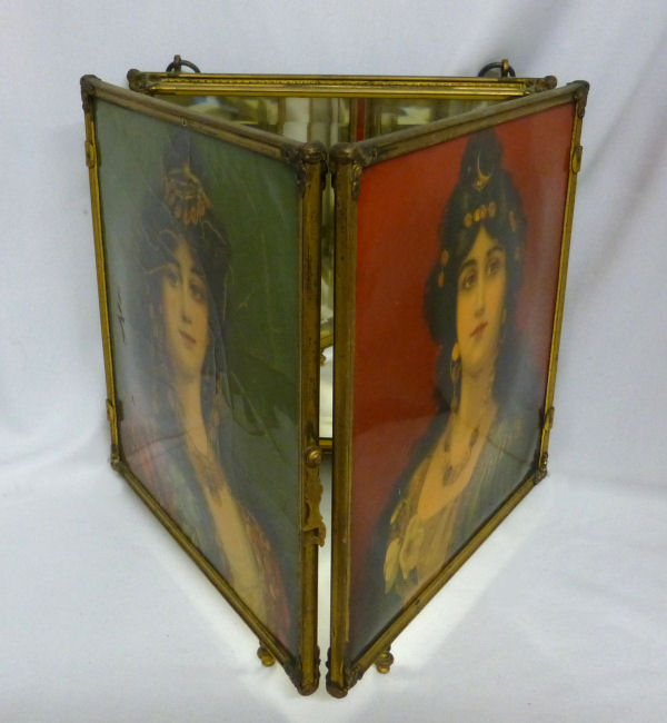 This is a beautiful Victorian tri-fold beveled mirror which can be hung or free-standing (has small feet). There are two portraits of gorgeous women on the two outer mirrors ... be sure to see close-ups. Each mirror has a very wide bevel -- 1/2" -- and they are in quite good condition for their age ... just some very small areas of foxing but still very usable. The outermost portrait has significant crazing but the interior one is excellent. The brass frame shows signs of age ... I have not polished it as I wish to keep items like this in as-found condition. The mirror latches closed for traveling. Please see all the pictures for condition. Each mirror measures 8-1/2" square. The height with the feet is 9-1/4". (Click on pic for more photos.) |
